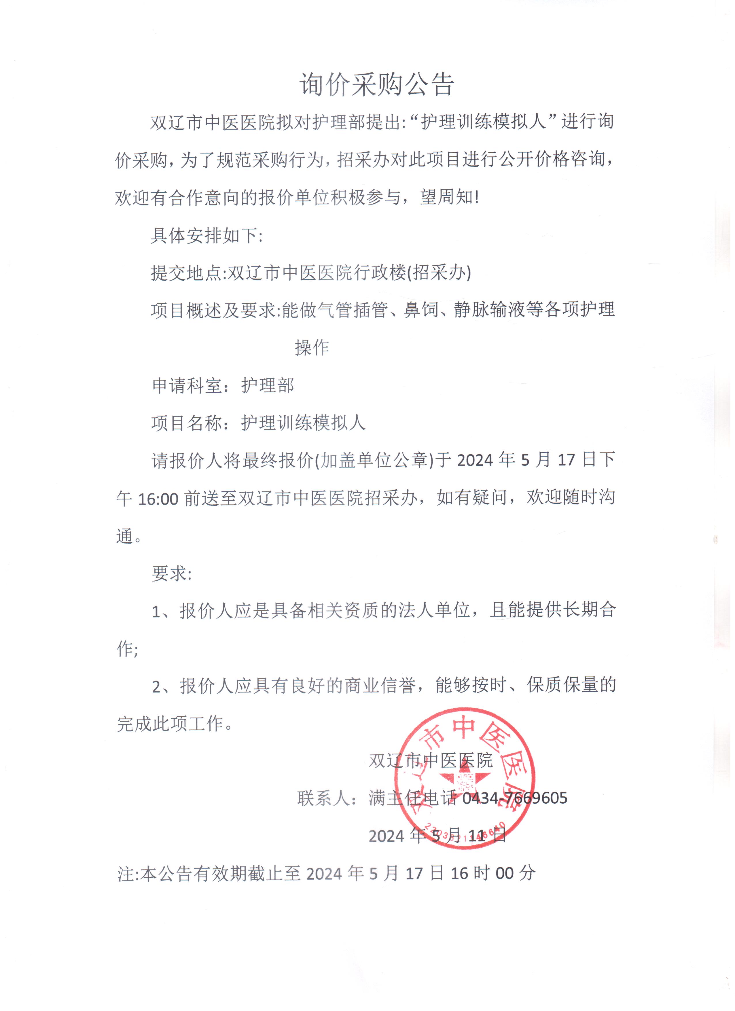 双辽市中医医院护理训练模拟人询价采购公告