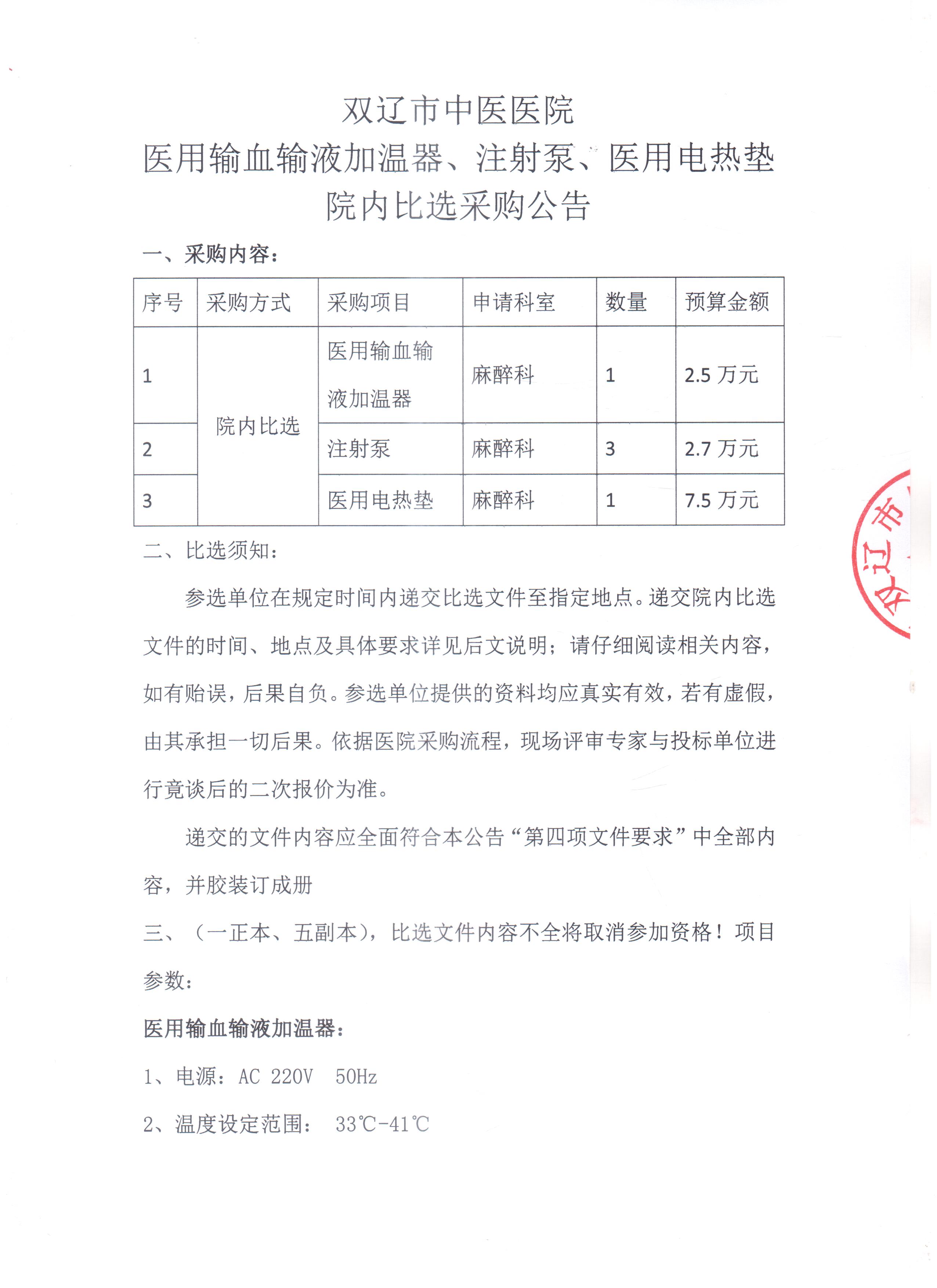 双辽市中医医院医用输血输液加温器、注射泵、医用电热垫采购公告