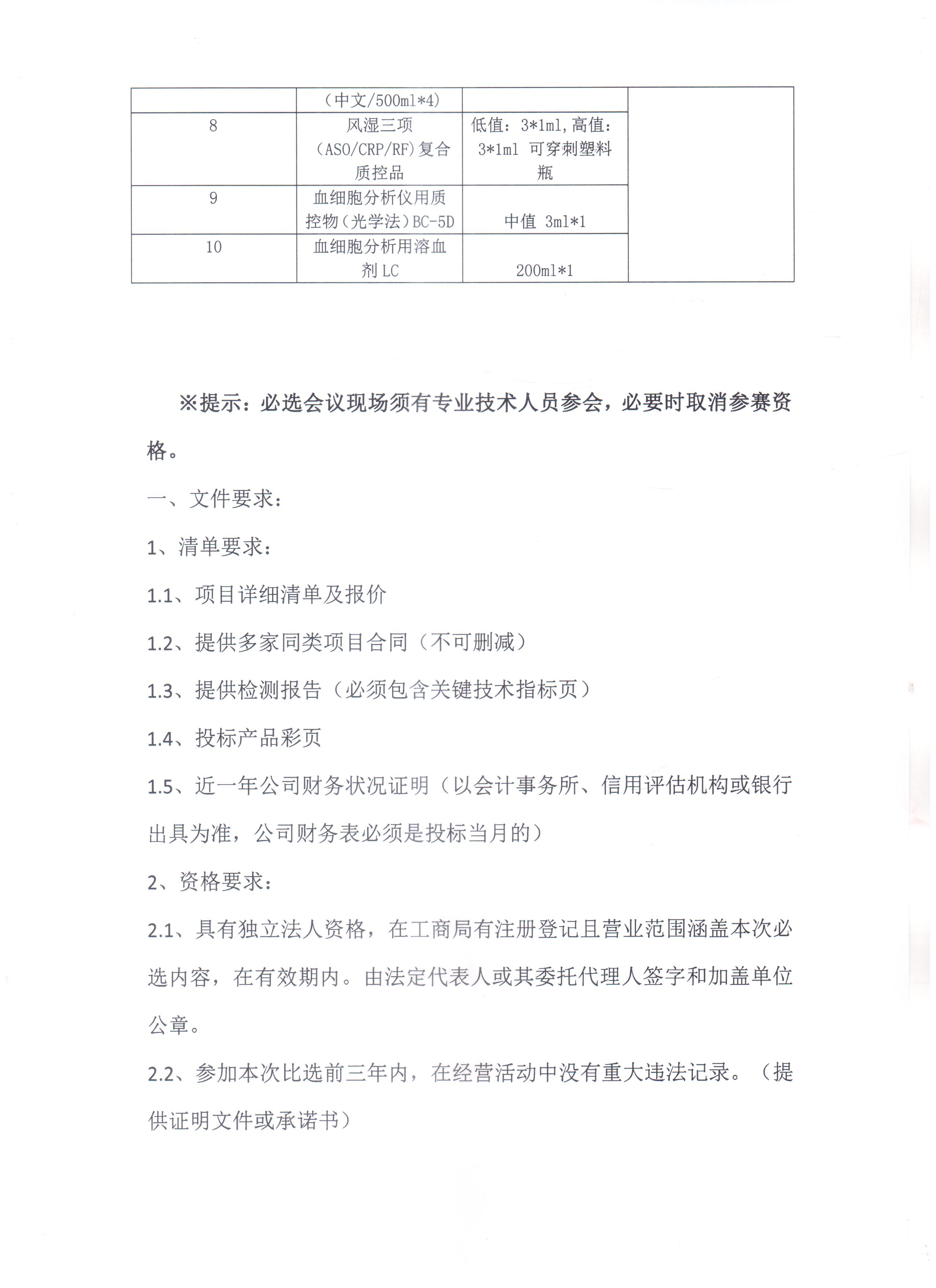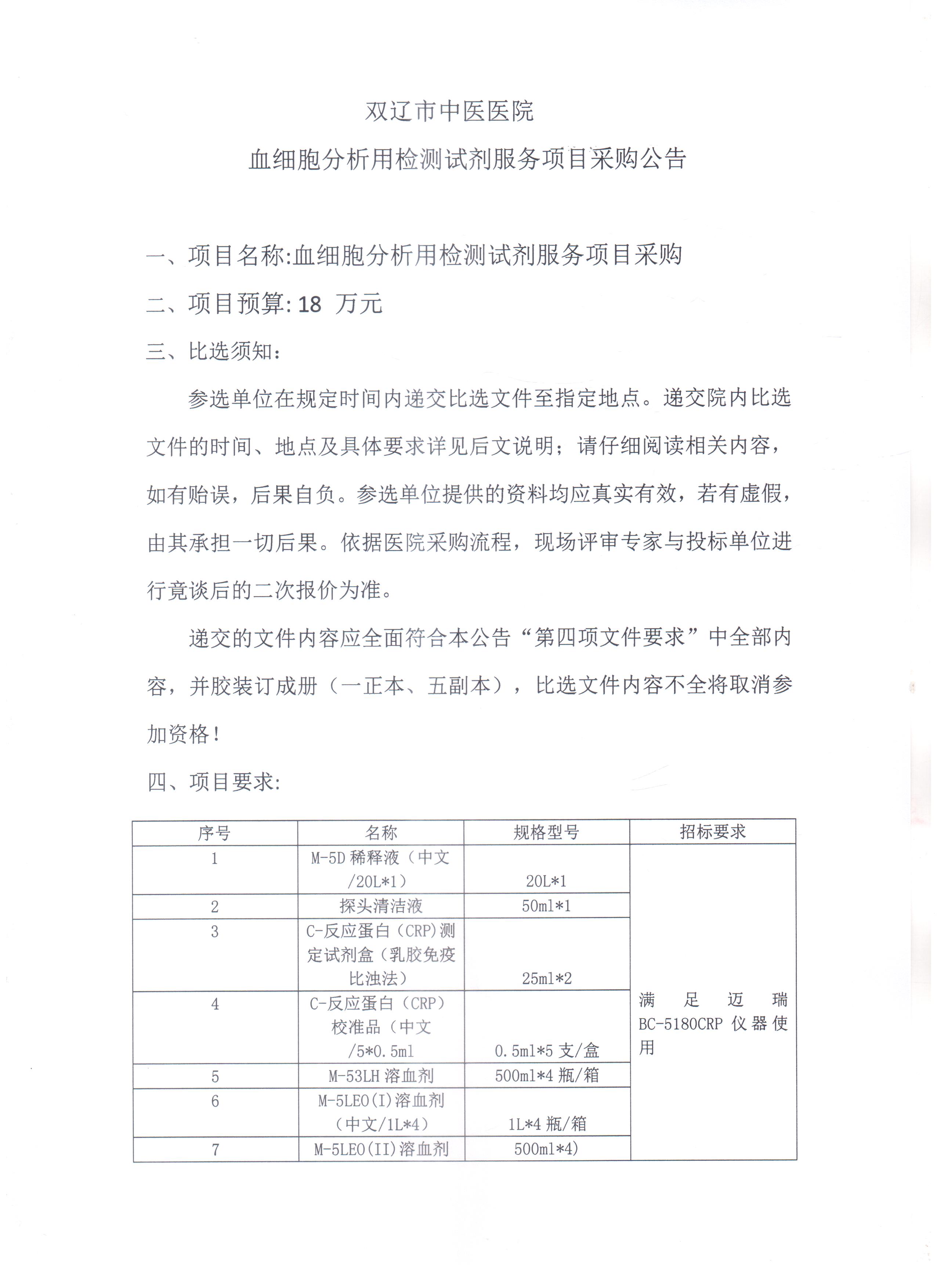 双辽市中医医院血细胞分析用检测试剂采购公告