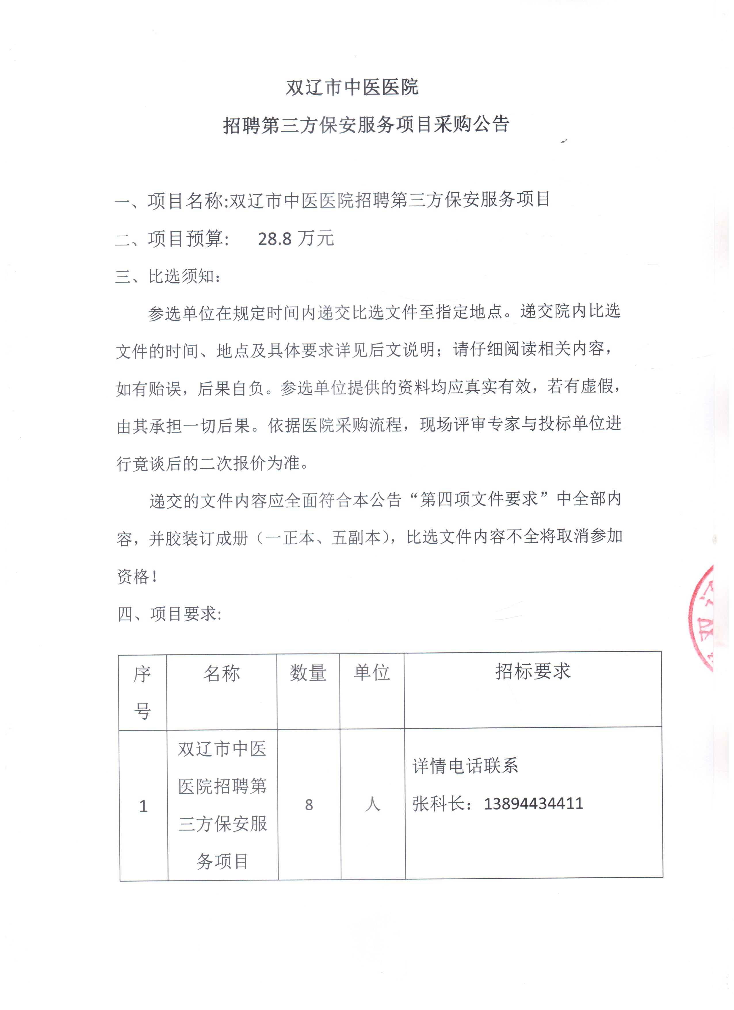 双辽市中医医院招聘第三方保安服务项目采购公告