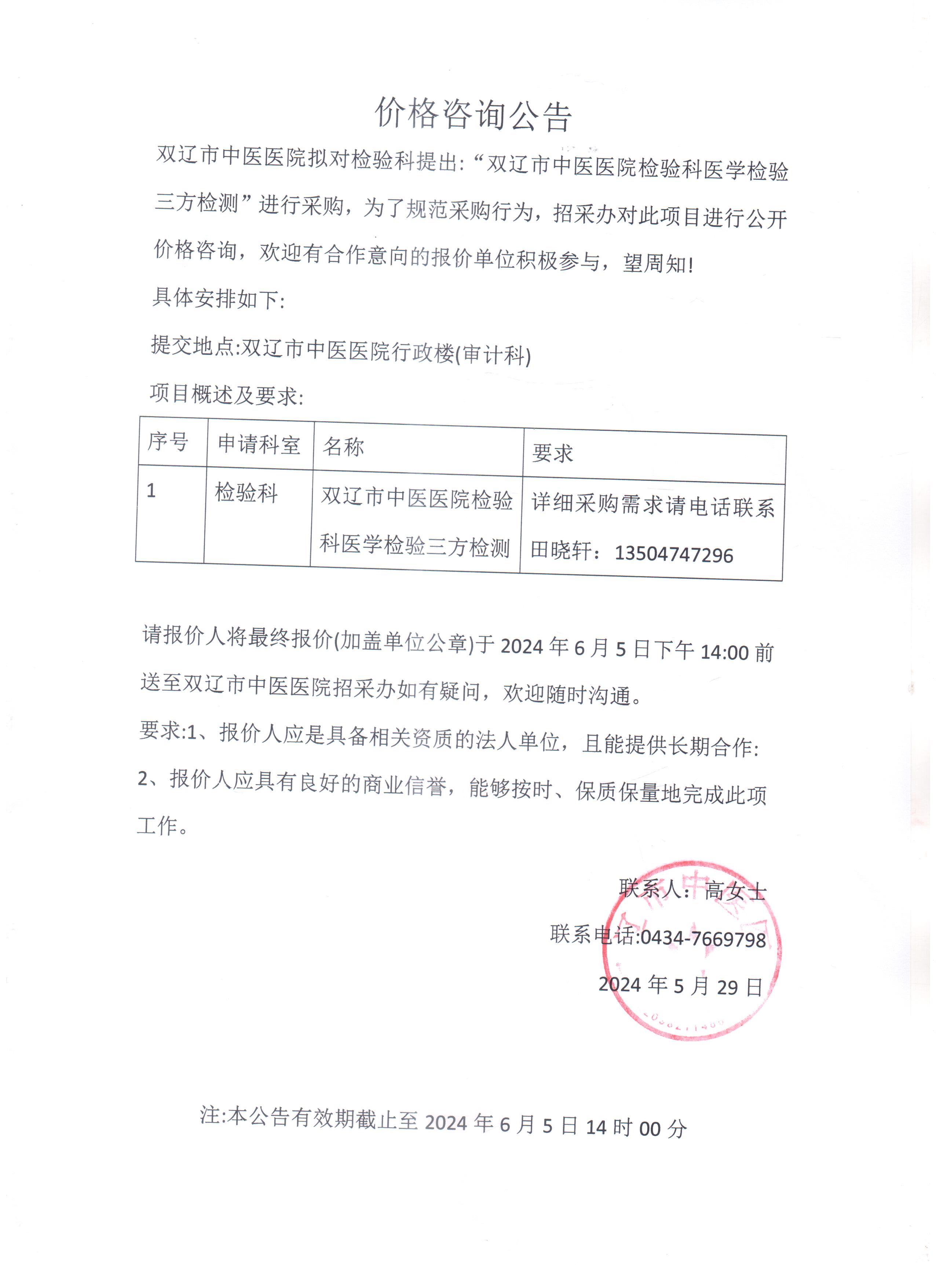 双辽市中医医院检验科医学检验三方检测价格咨询公告