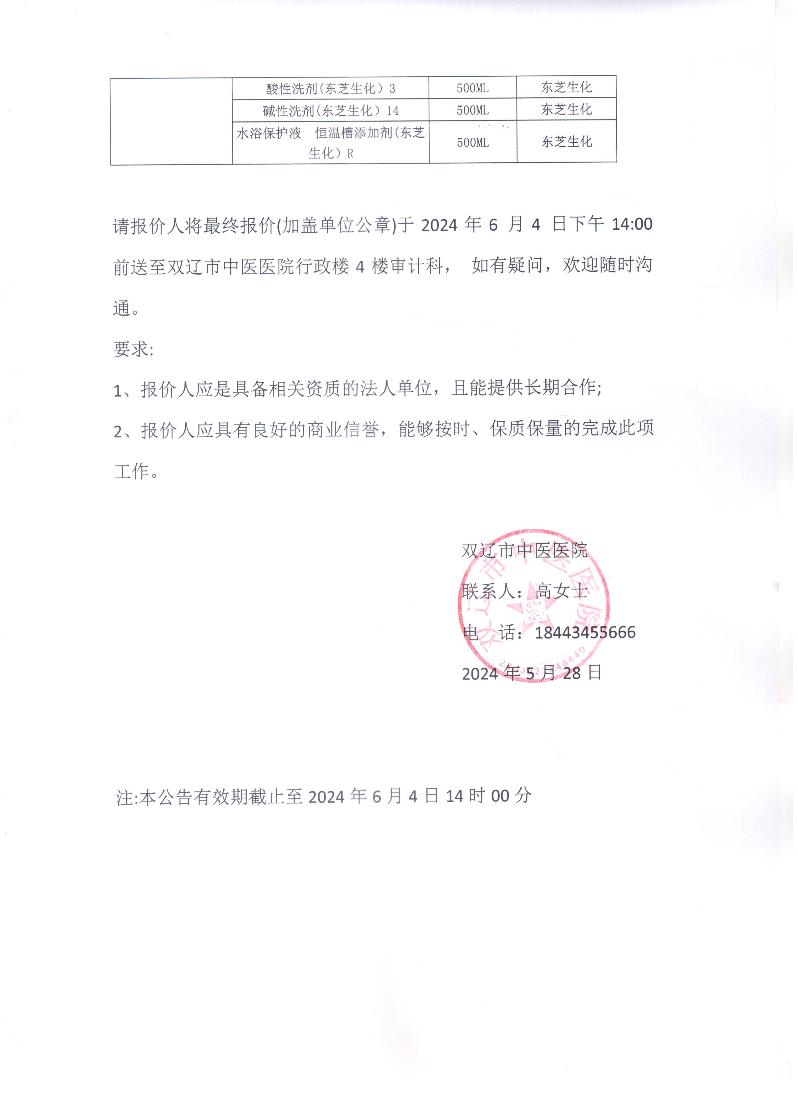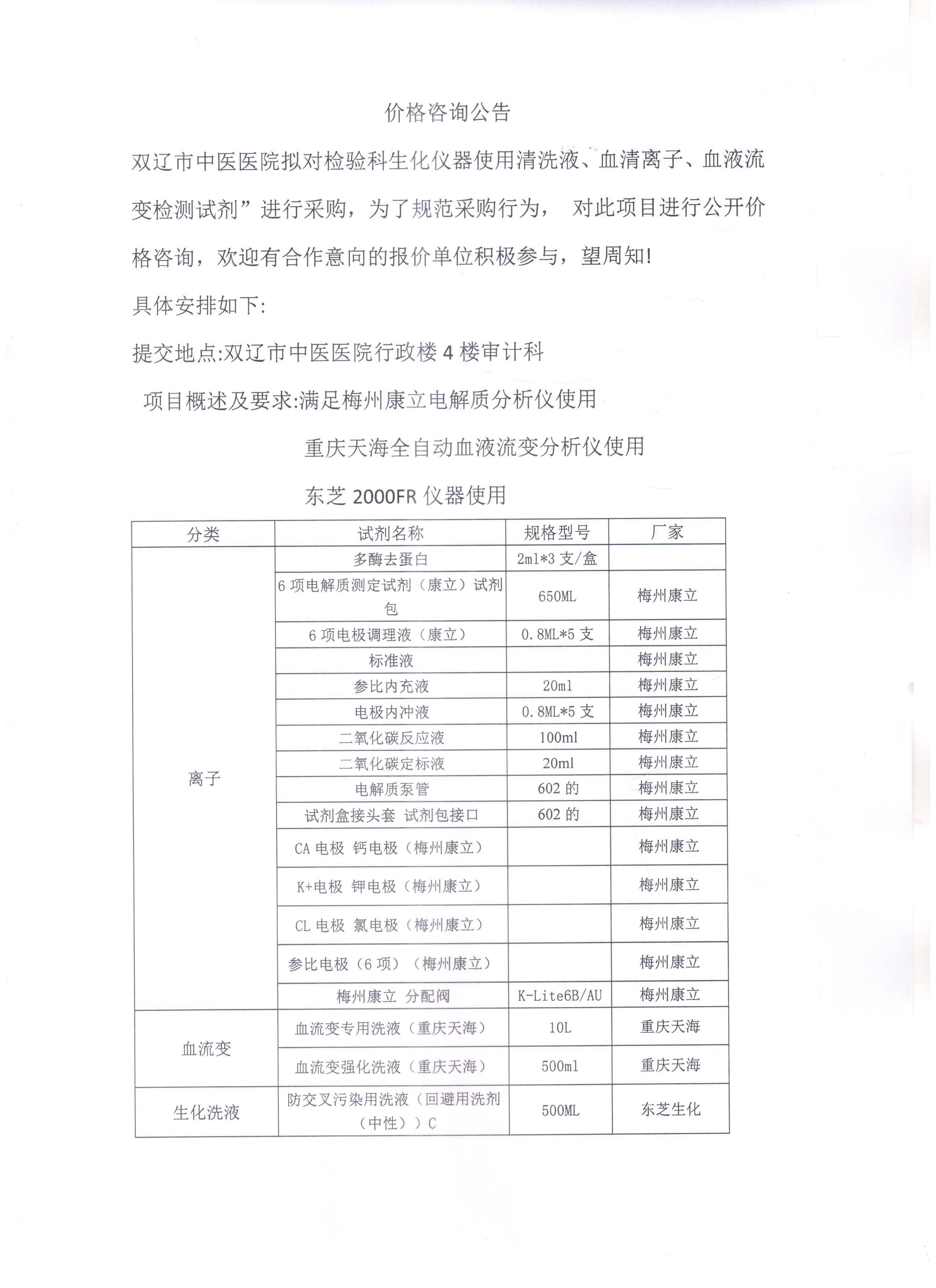 双辽市中医医院生化仪器使用清洗液、血清离子、血液流变检测试剂价格咨询公告