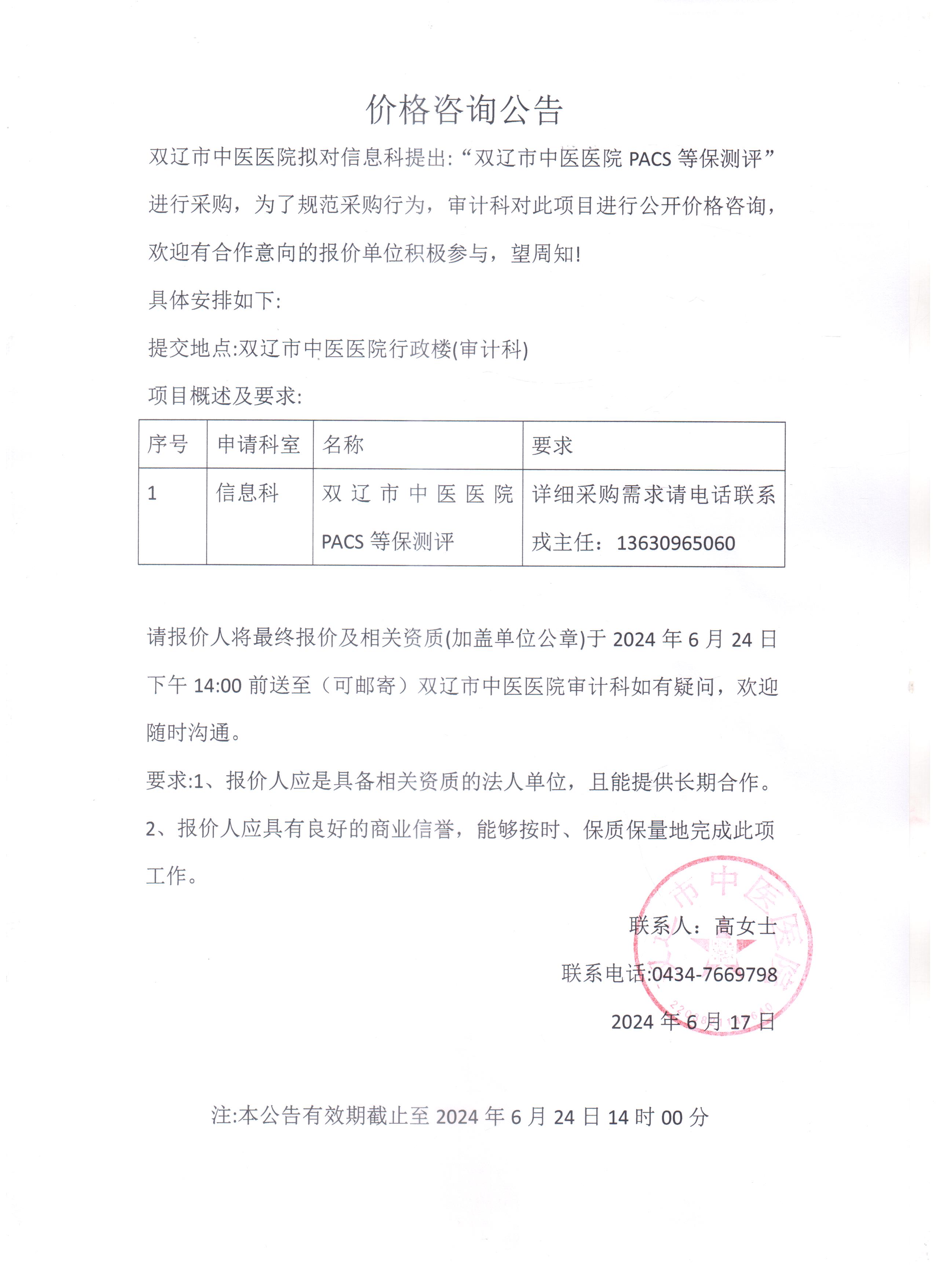 双辽市中医医院PACS等保测评价格咨询公告