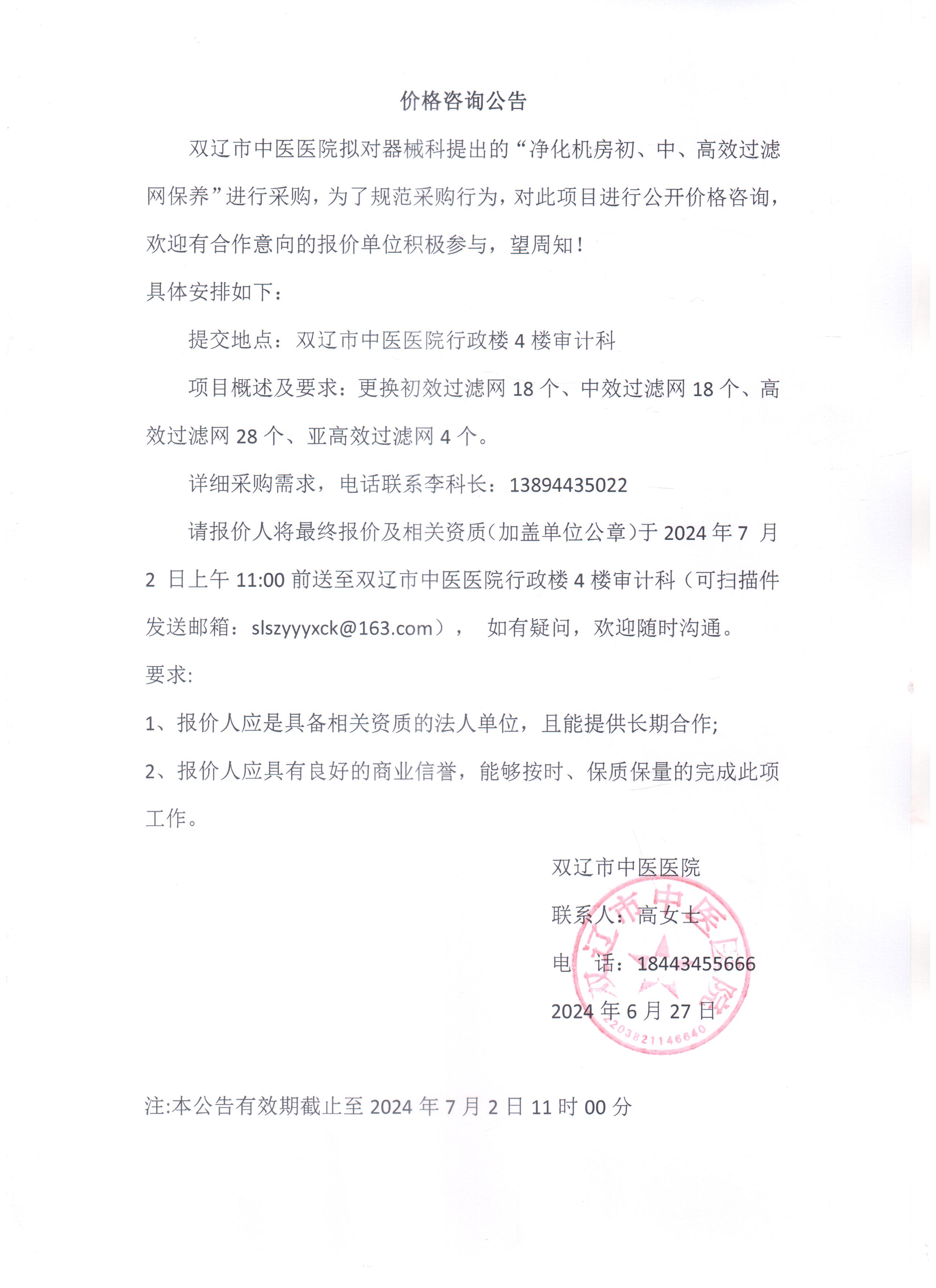 双辽市中医医院净化机房初、中、高效过滤网保养价格咨询公告