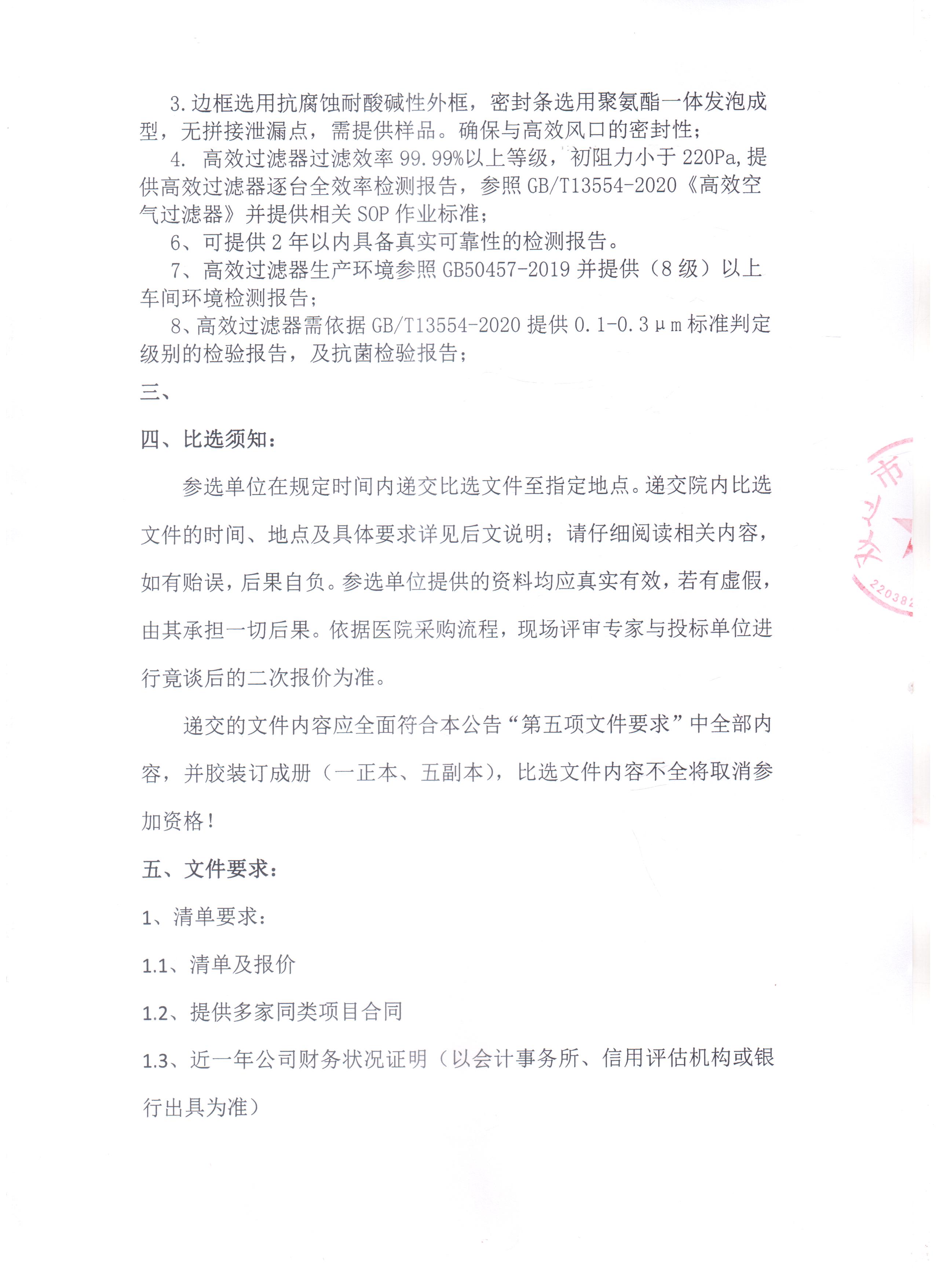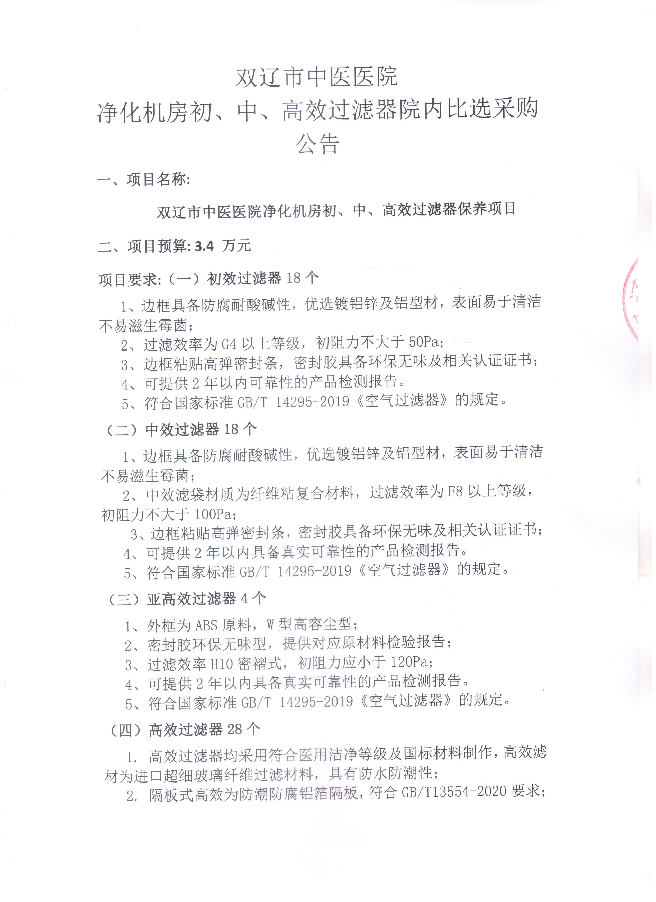 双辽市中医医院净化机房初、中、高效过滤网保养采购公告