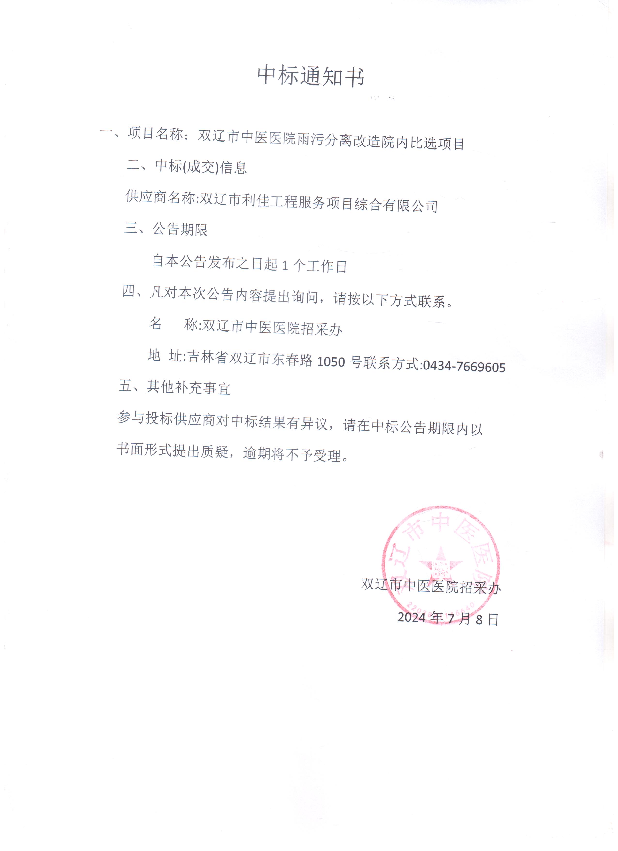 双辽市中医医院雨污分离改造中标通知书