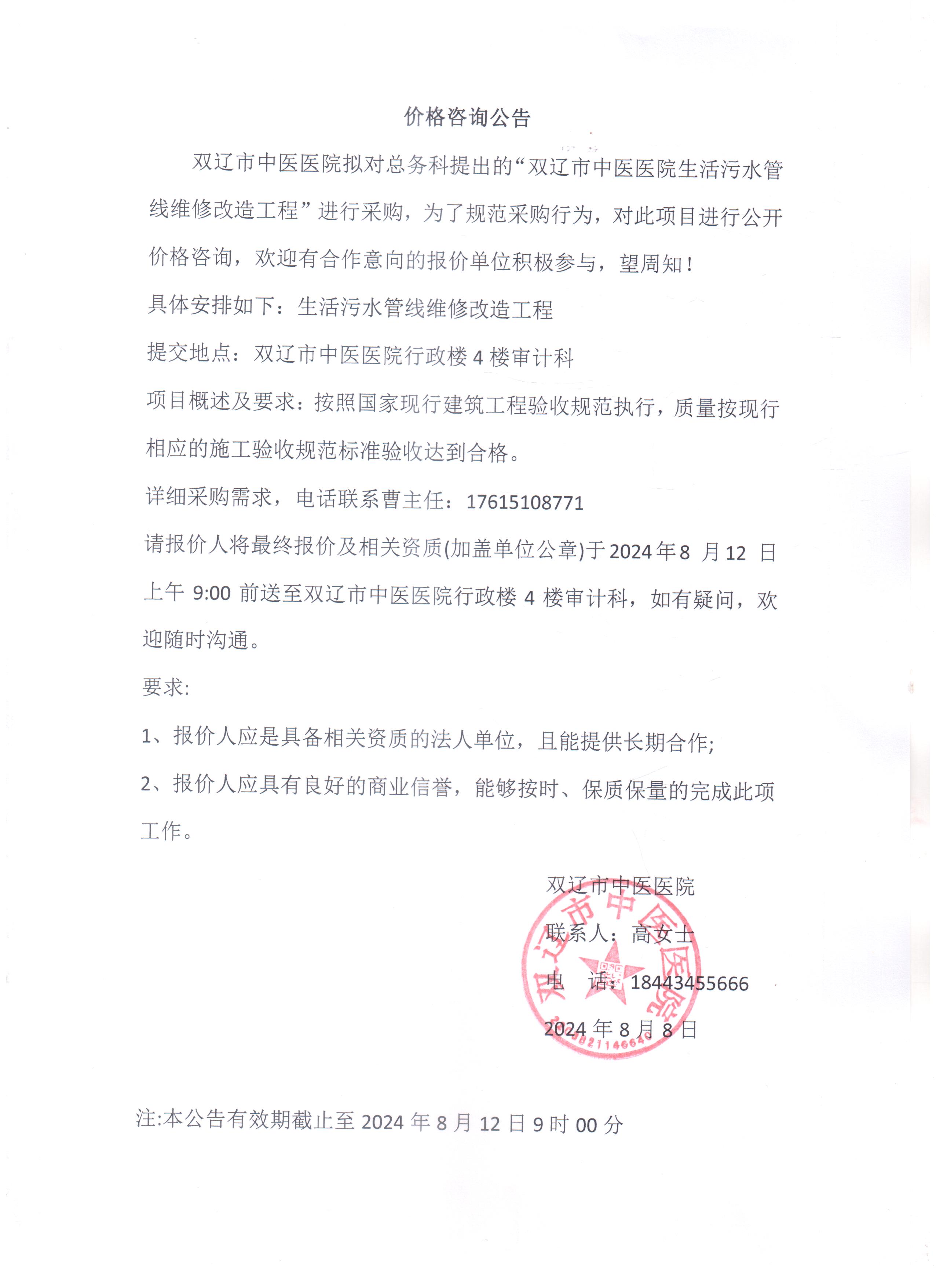 双辽市中医医院生活污水管线维修改造工程价格咨询公告