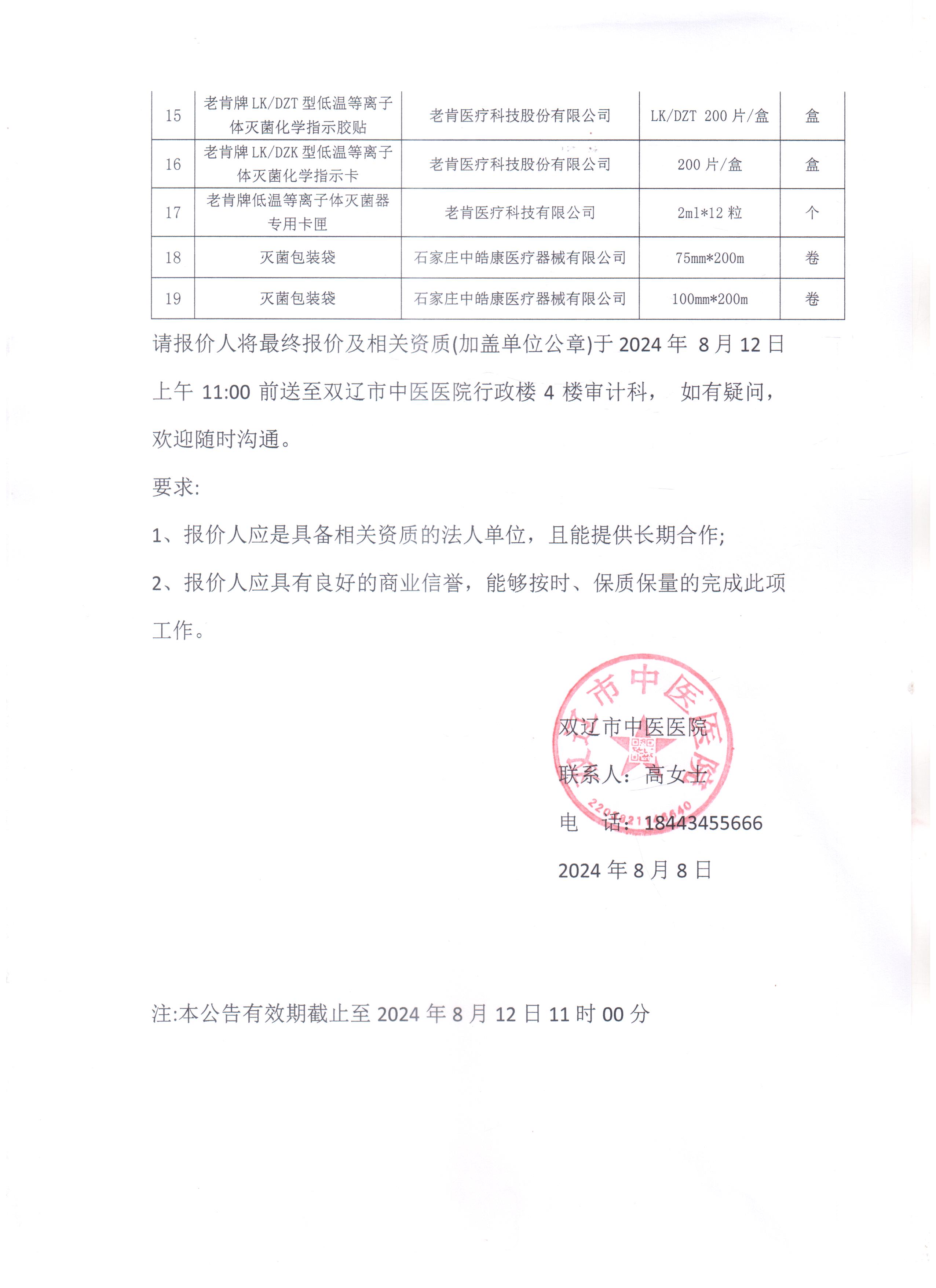 双辽市中医医院消毒供应科使用耗材价格咨询公告