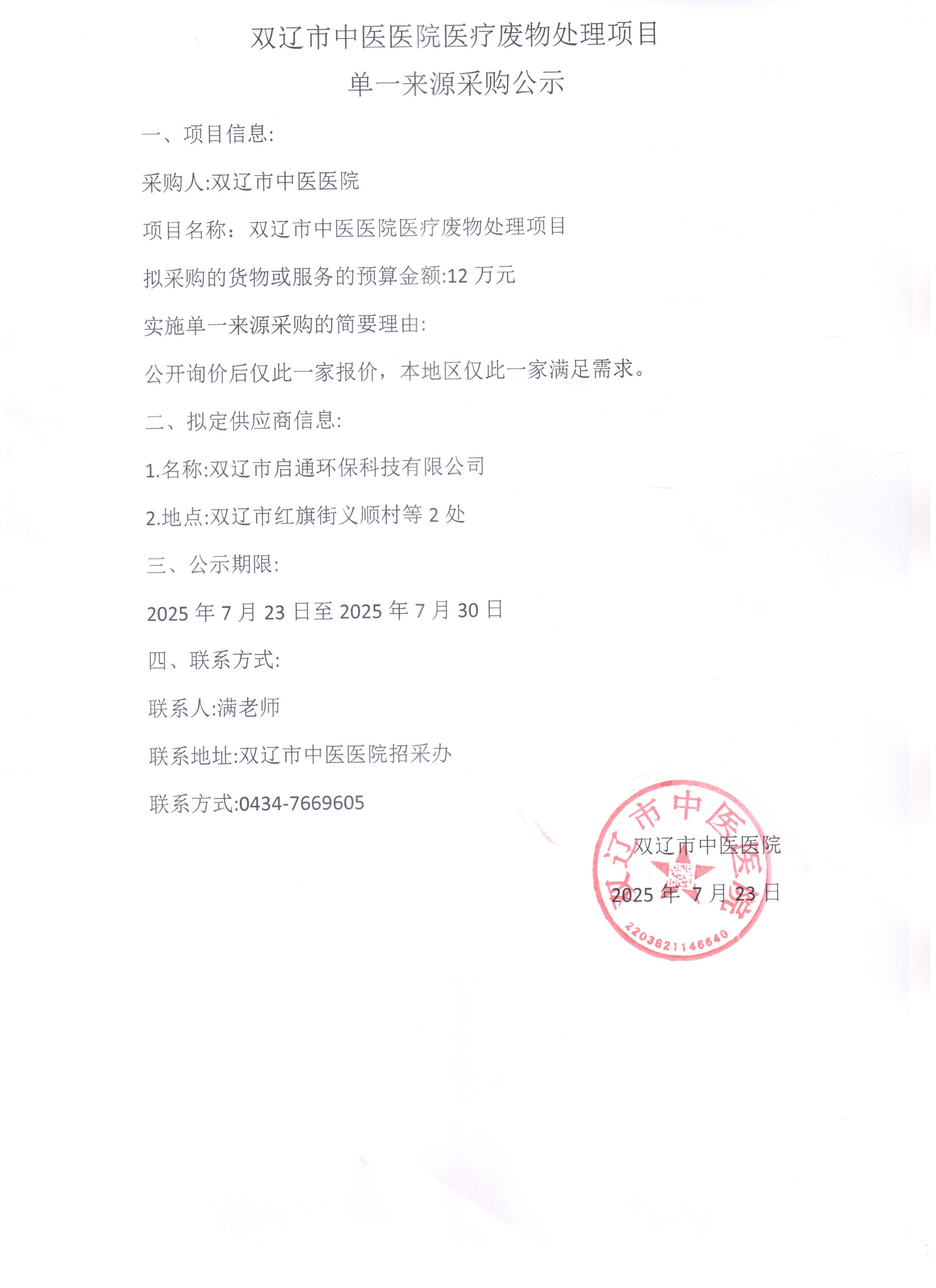 双辽市中医医院医疗废物处理项目单一来源采购公告
