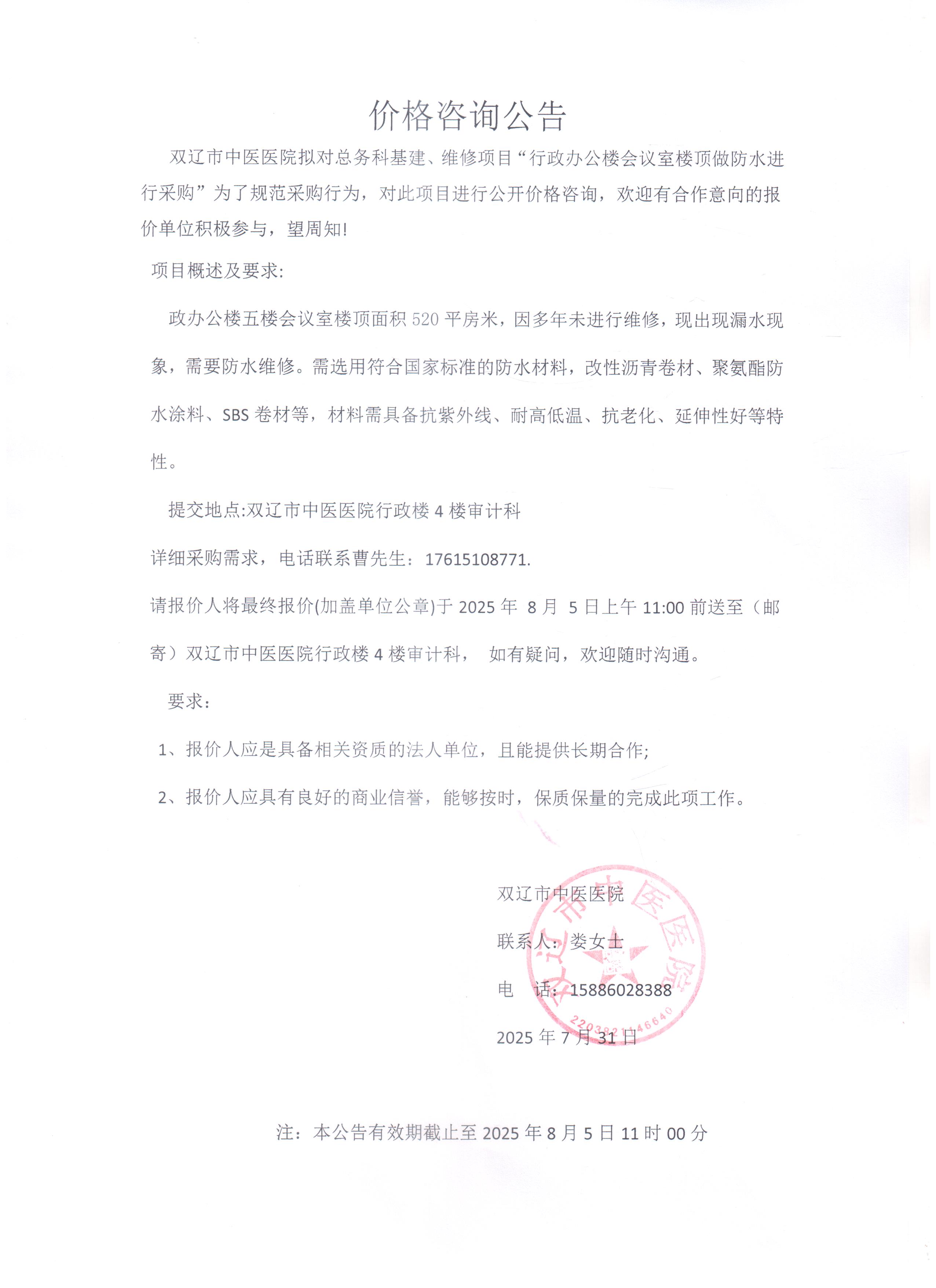 双辽市中医医院行政办公楼会议室楼顶做防水价格咨询公告