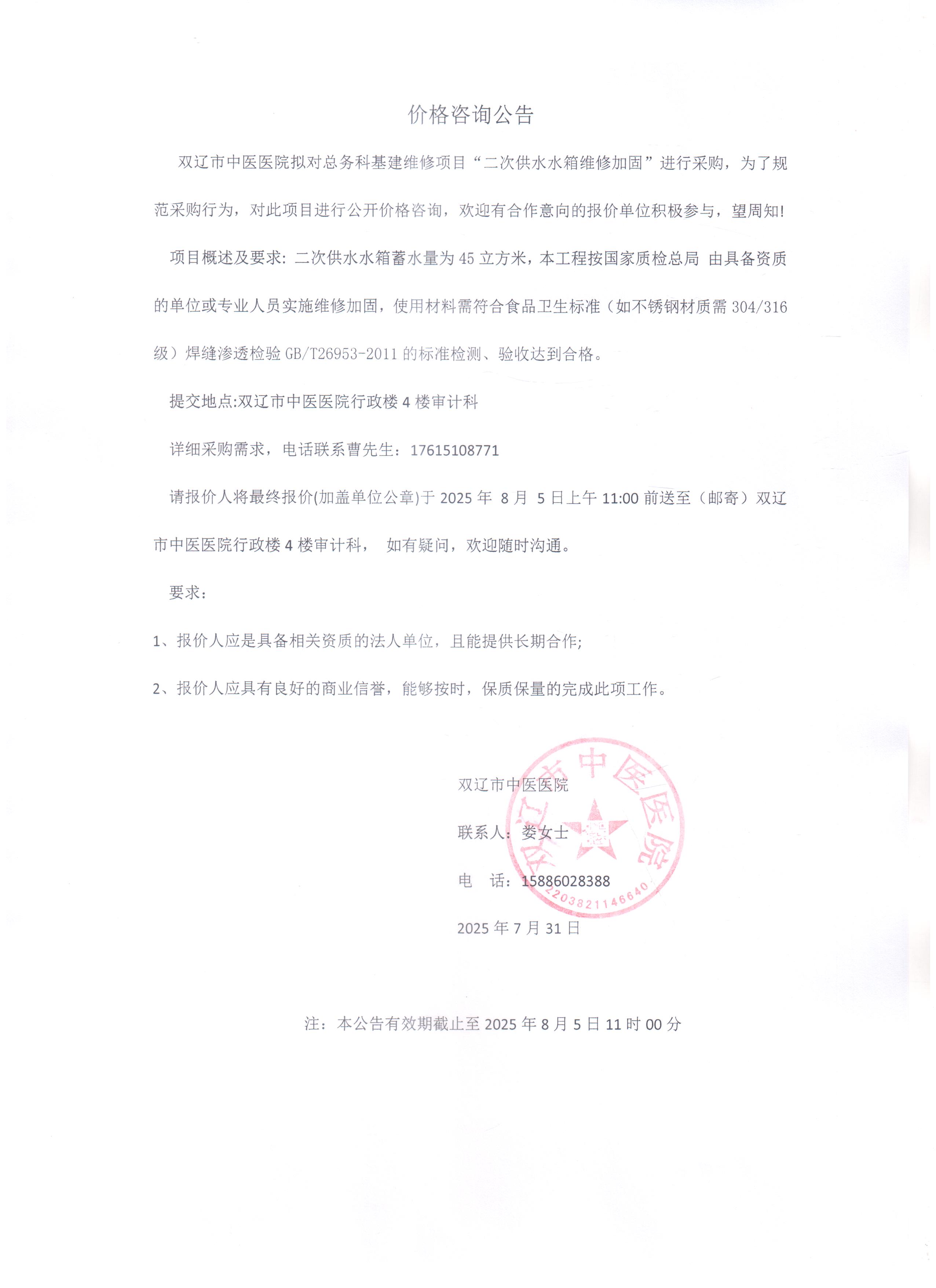双辽市中医医院二次供水水箱维修加固价格咨询公告