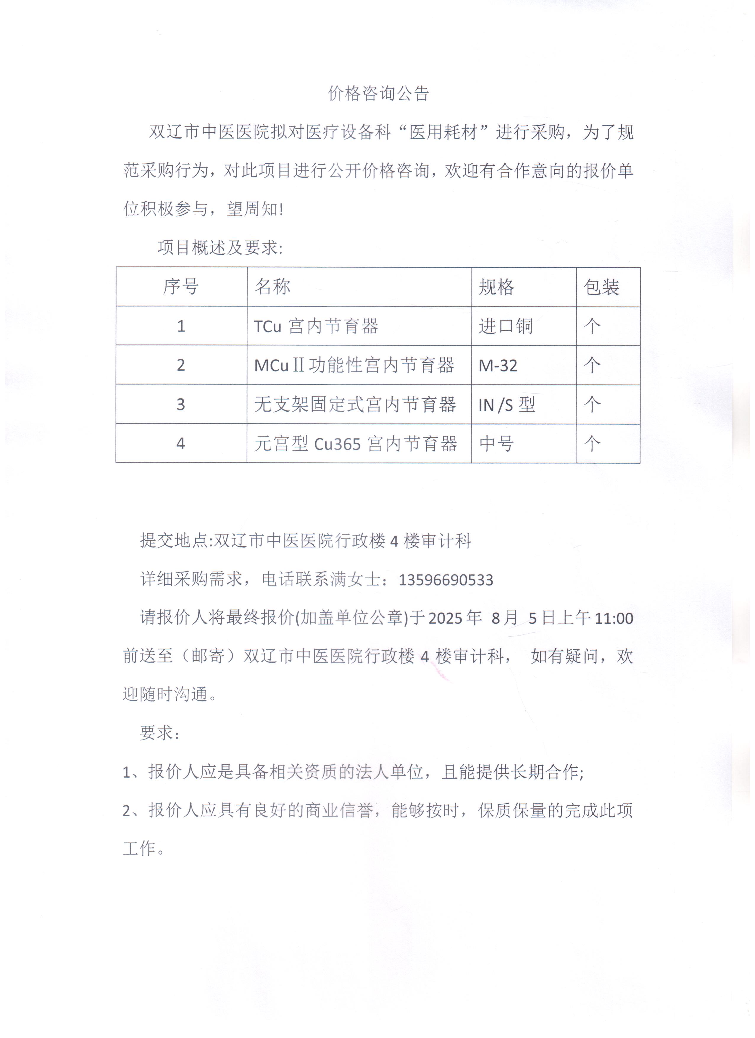双辽市中医医院医疗耗材价格咨询公告
