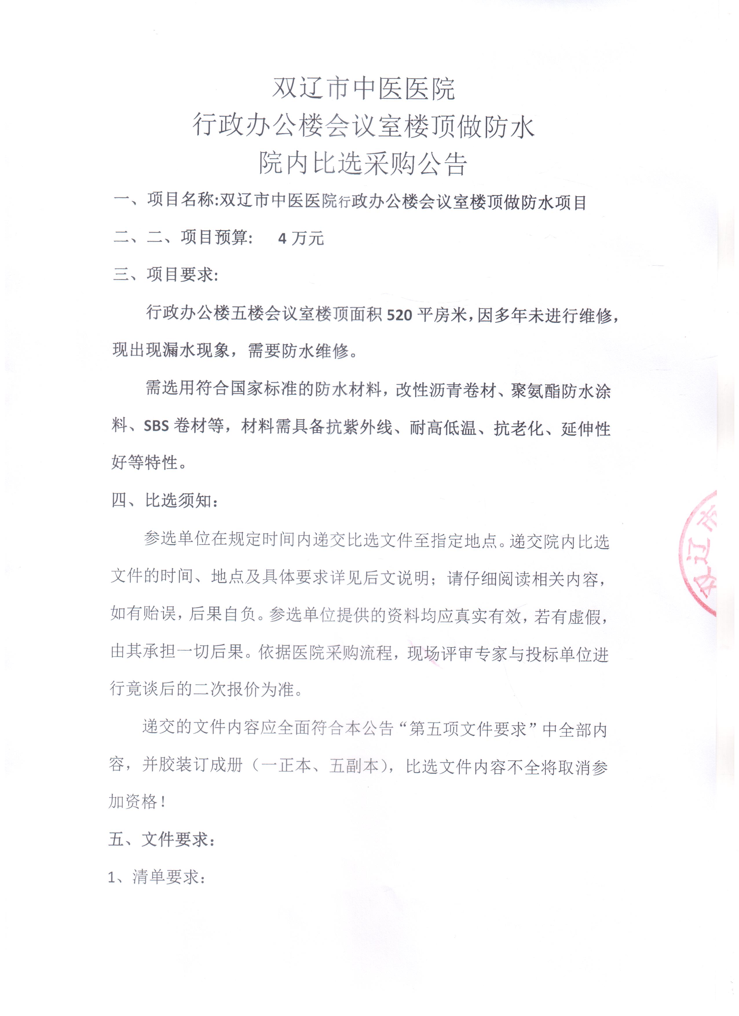 双辽市中医医院行政办公楼会议室楼顶做防水采购公告