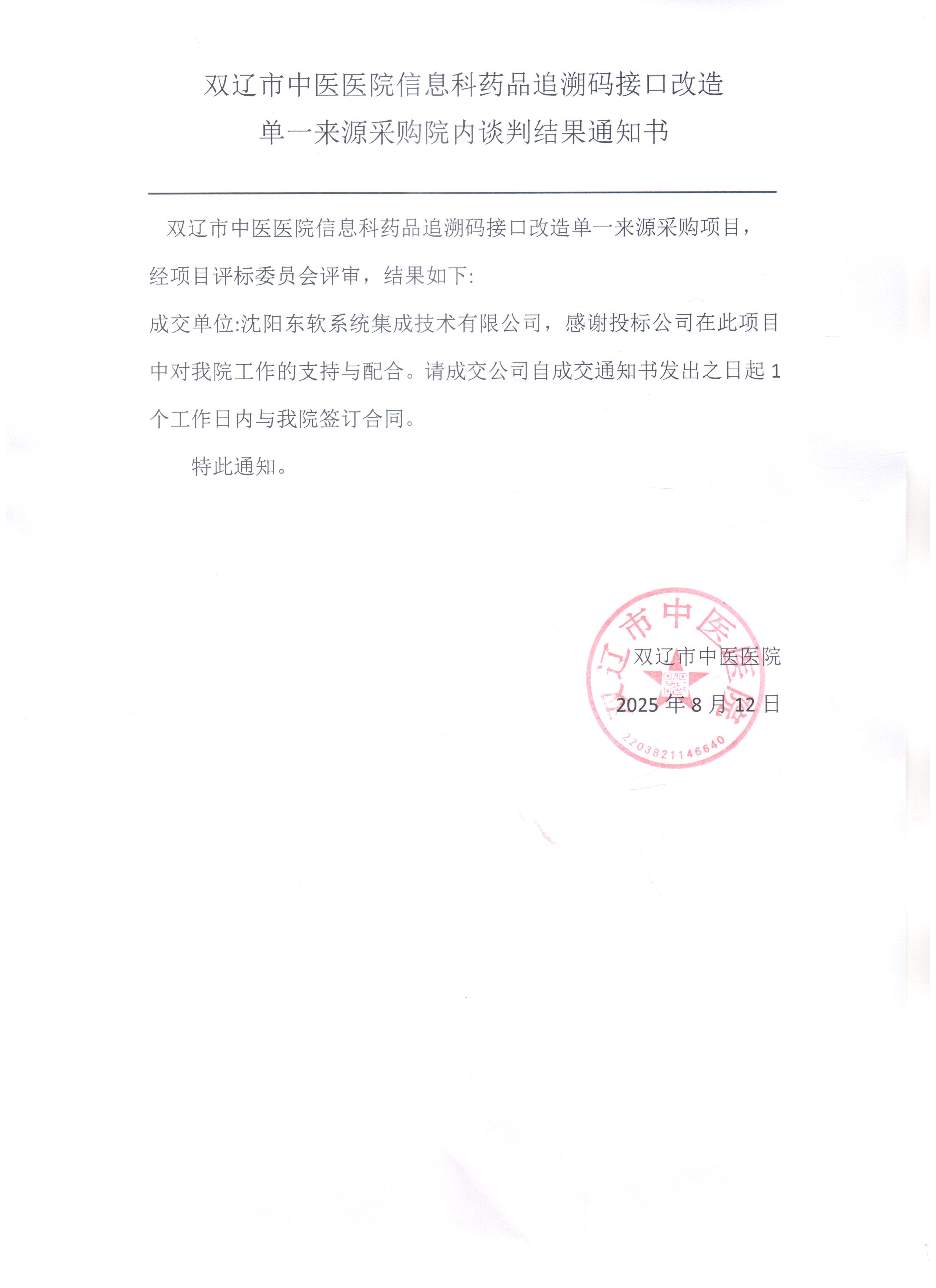双辽市中医医院药品追溯码接口改造项目单一来源采购院内谈判结果通知书
