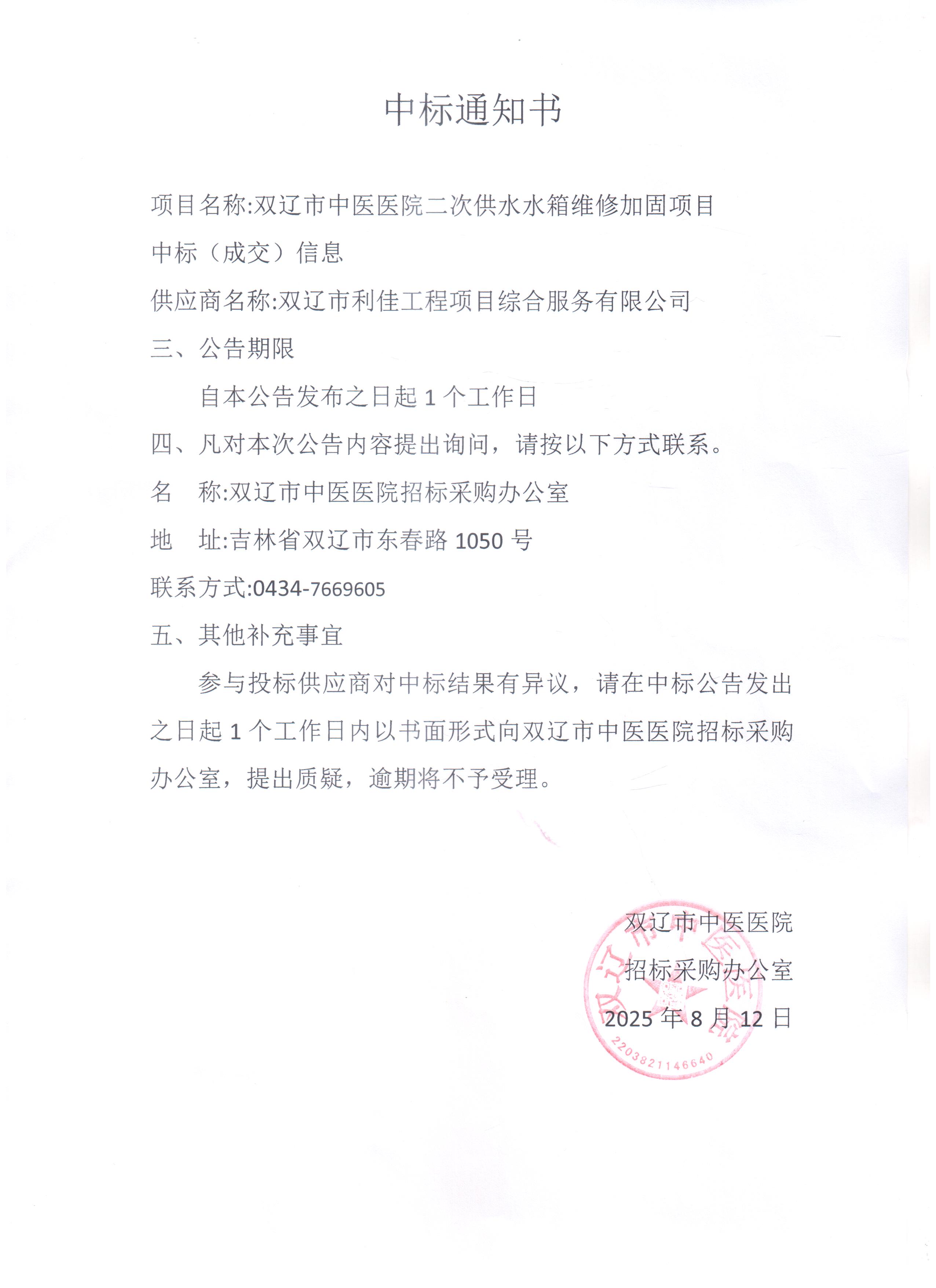 双辽市中医医院二次供水水箱维修加固中标通知书