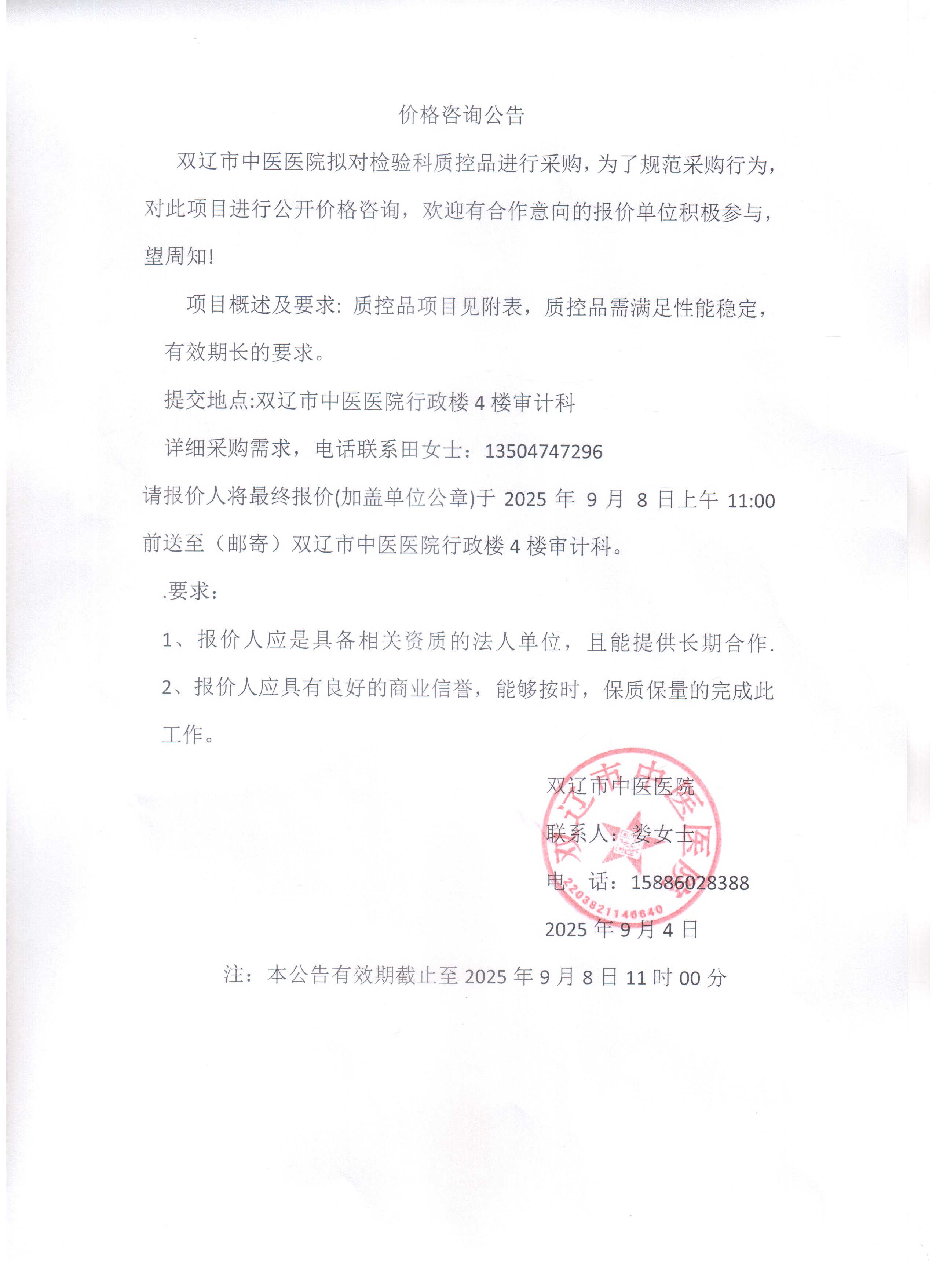 双辽市中医医院检验科质控品价格咨询公告
