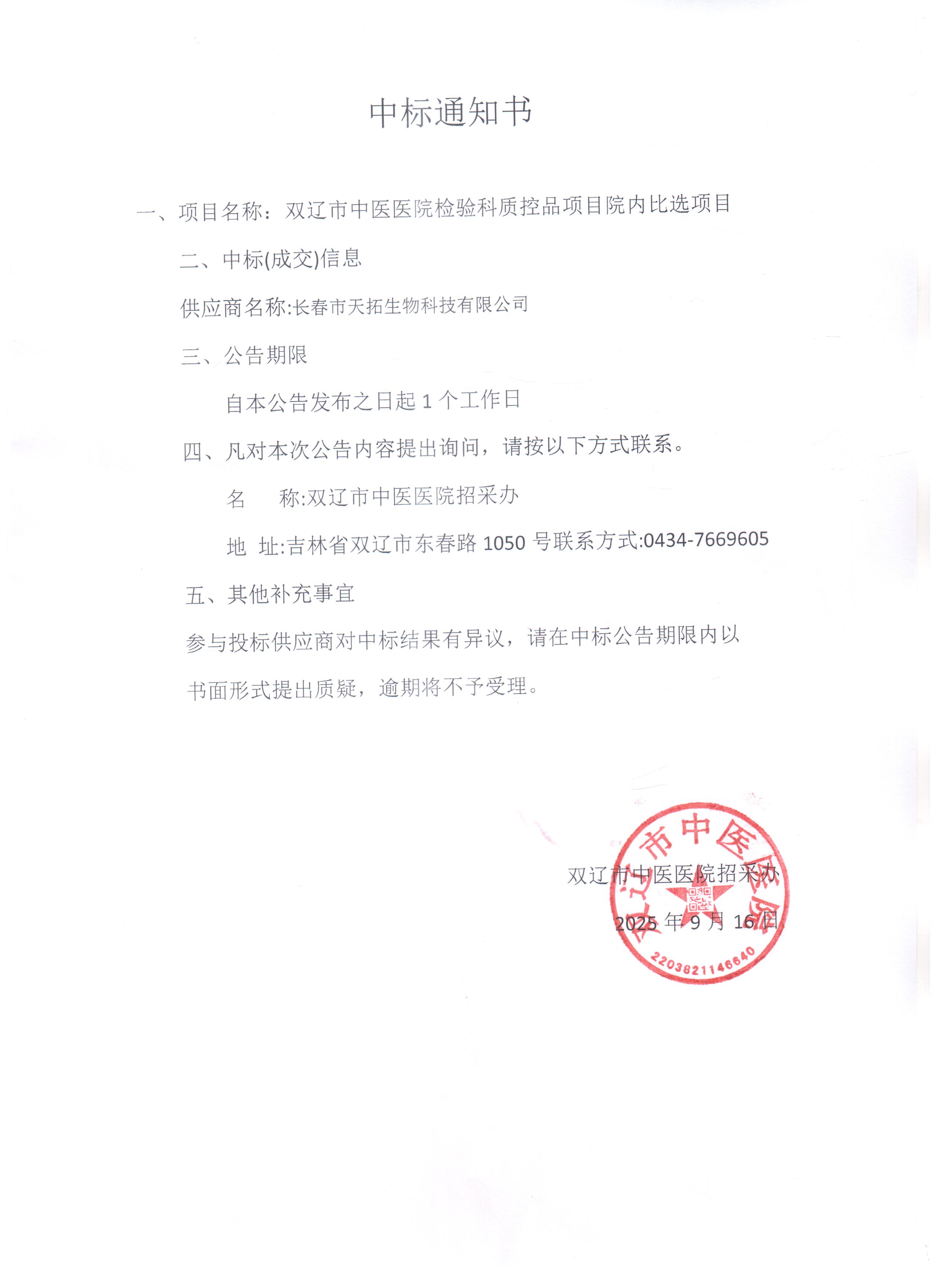 双辽市中医医院检验科质控品中标通知书