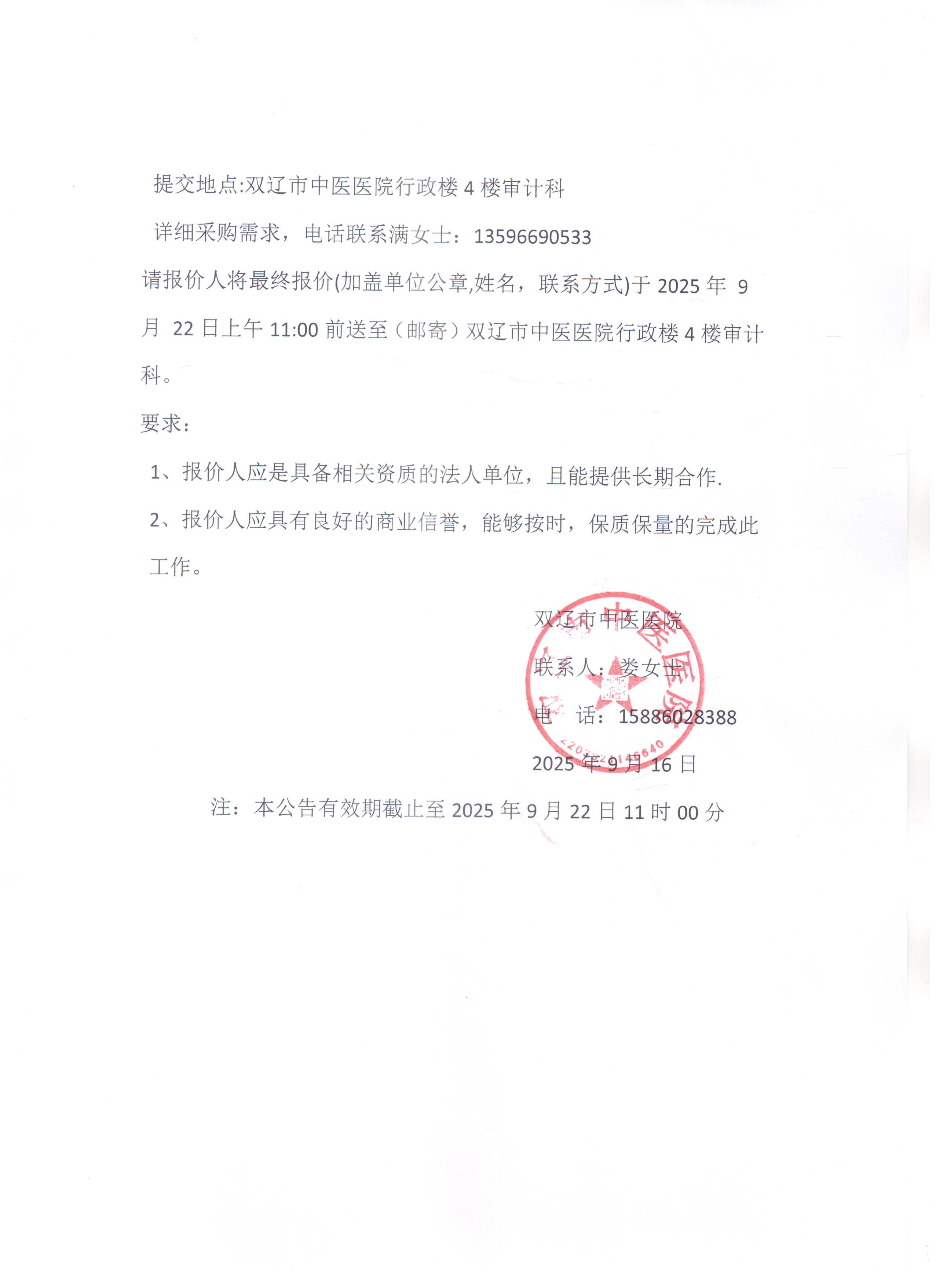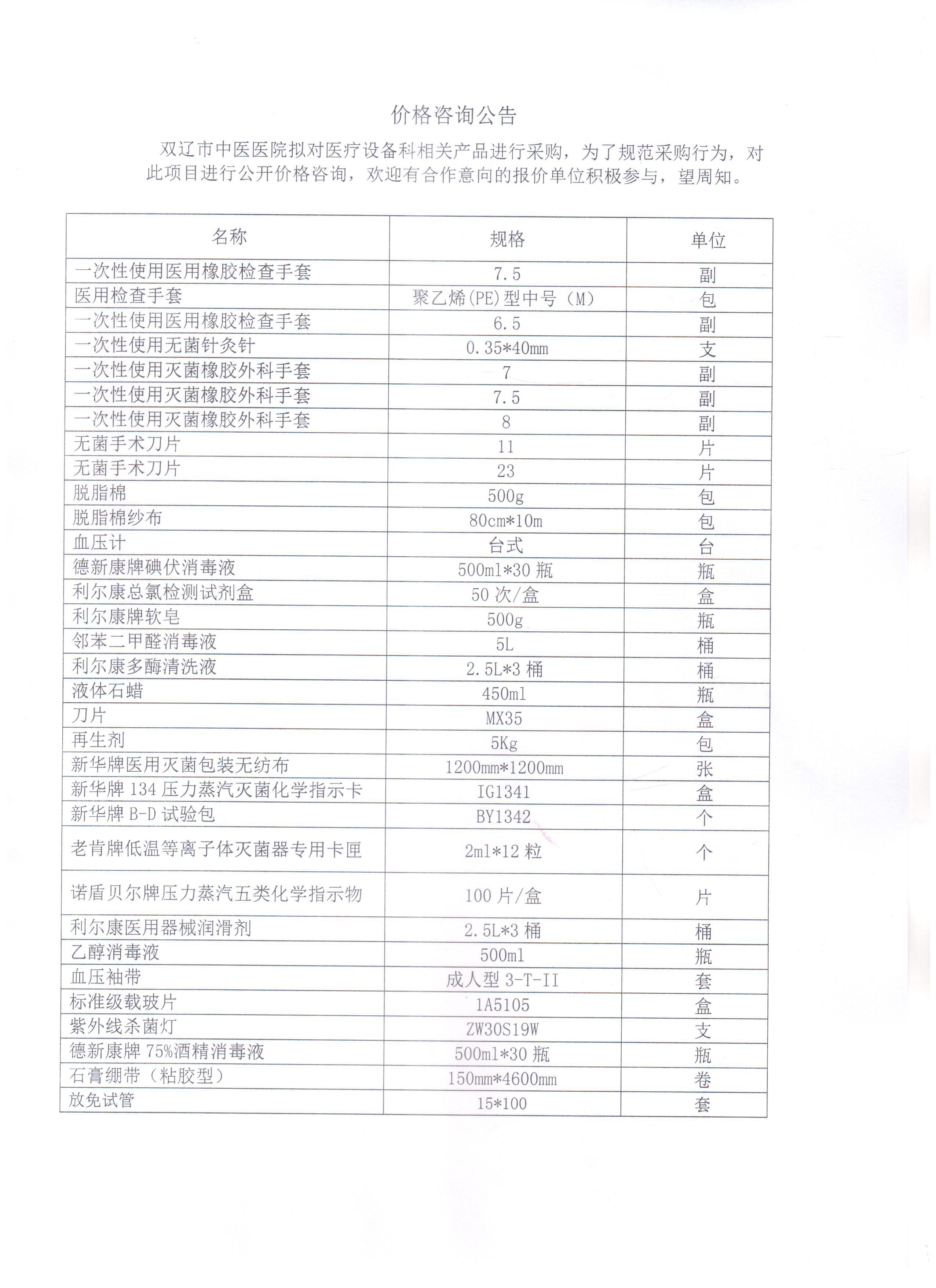 双辽市中医医院医疗设备科相关产品价格咨询公告