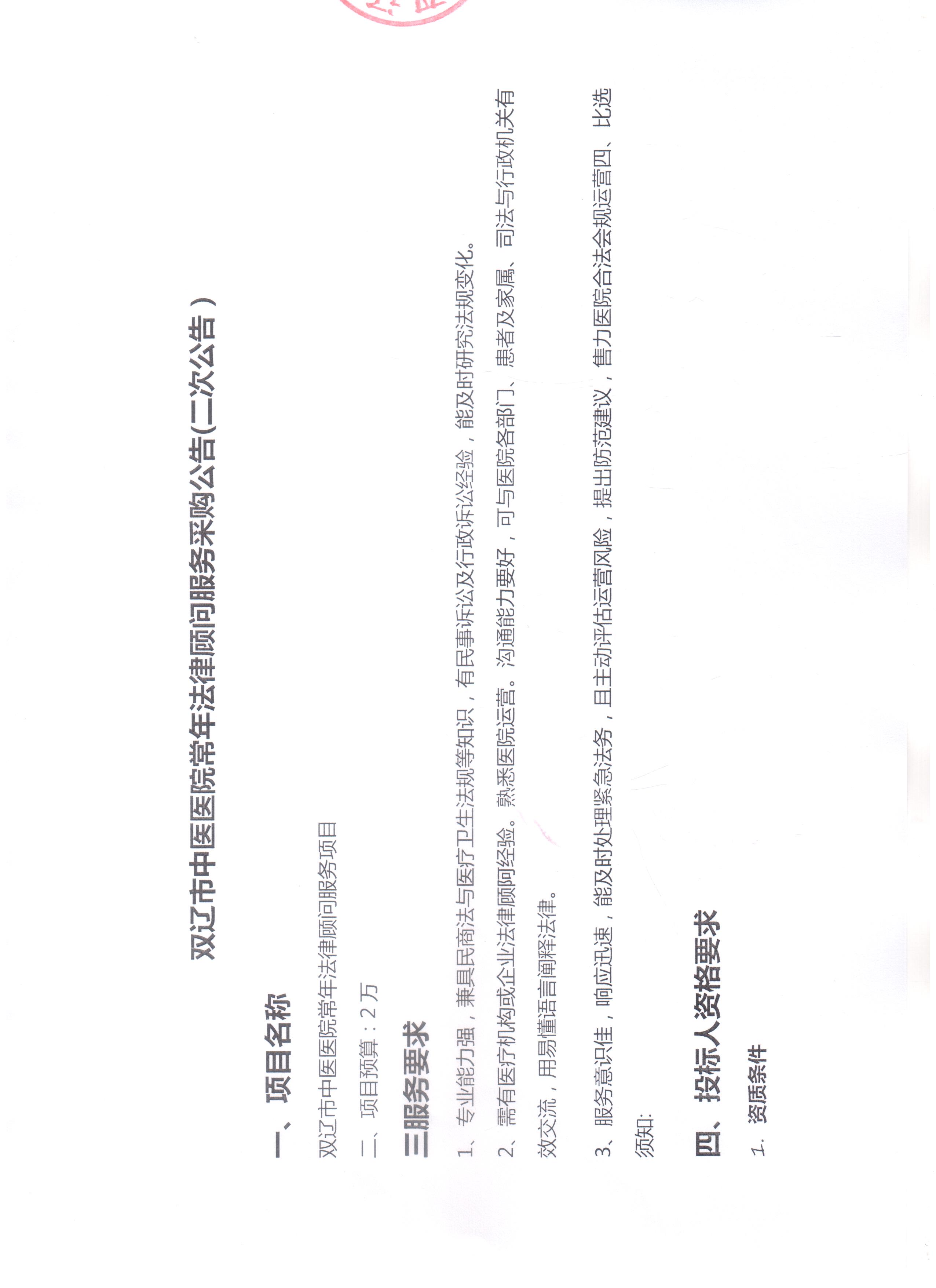 双辽市中医医院聘请法律顾问采购公告(二次公告)