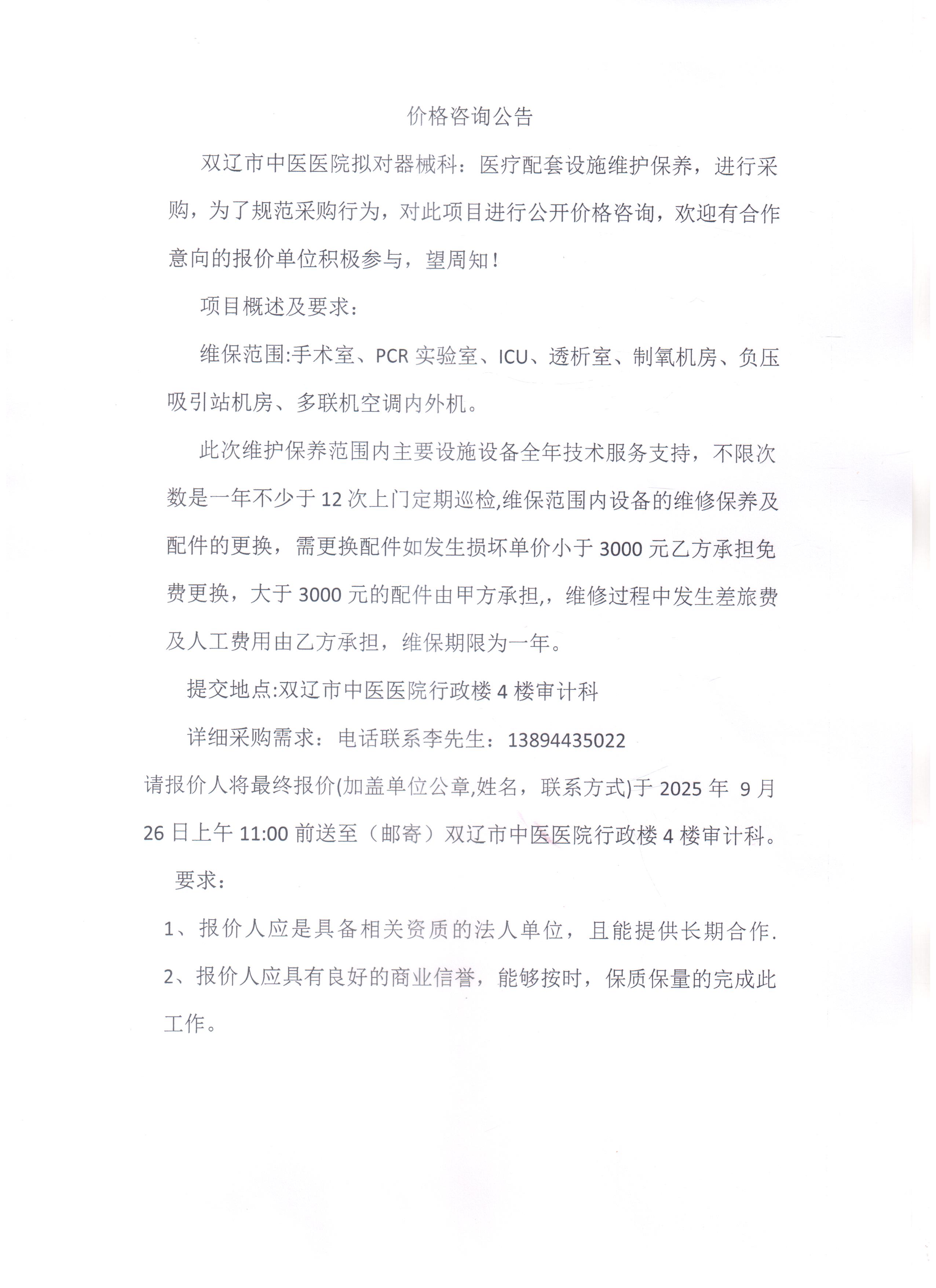 双辽市中医医院医疗配套设施维护保养价格咨询公告