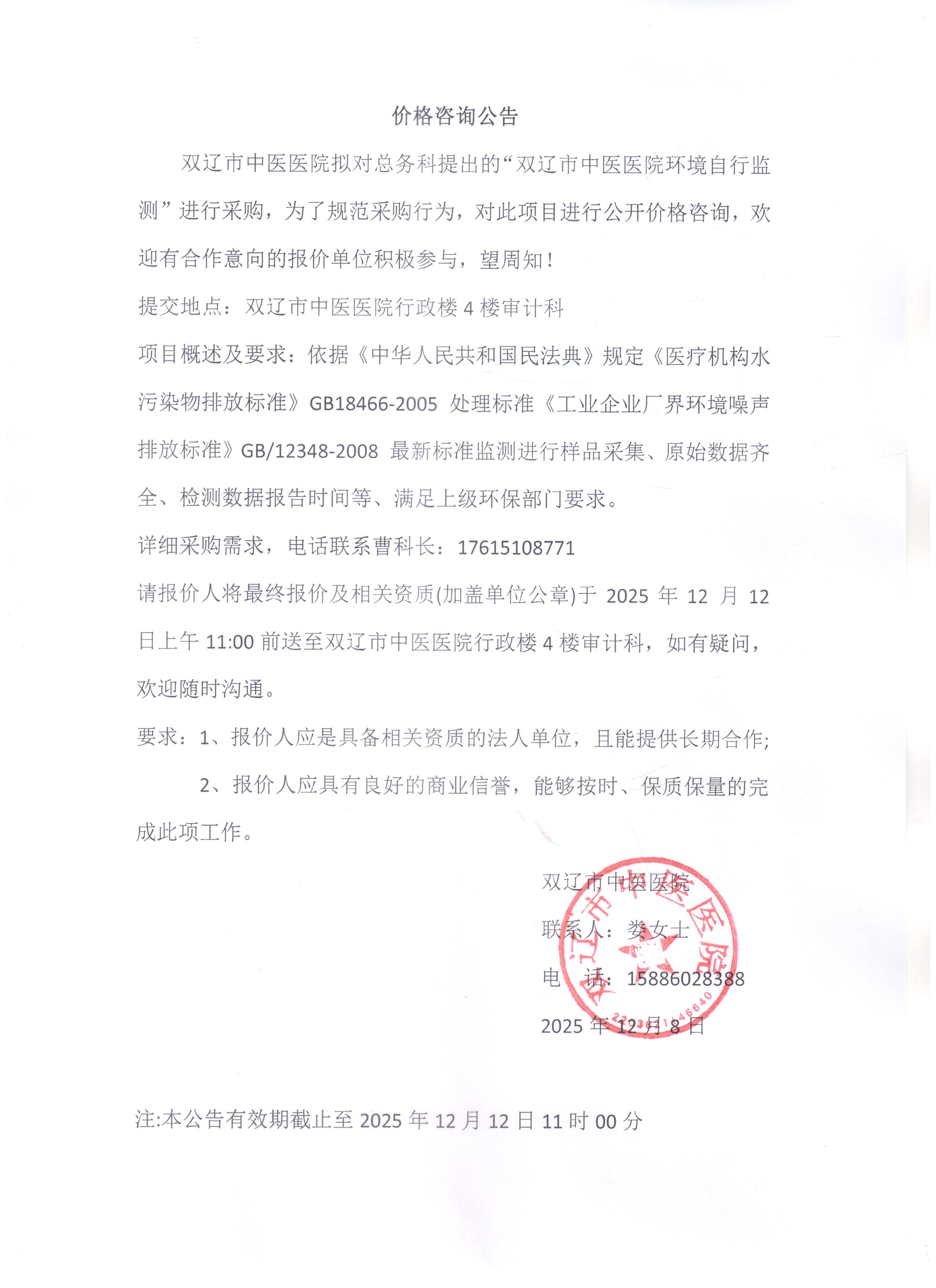 双辽市中医医院总务科环境自行监测价格咨询公告