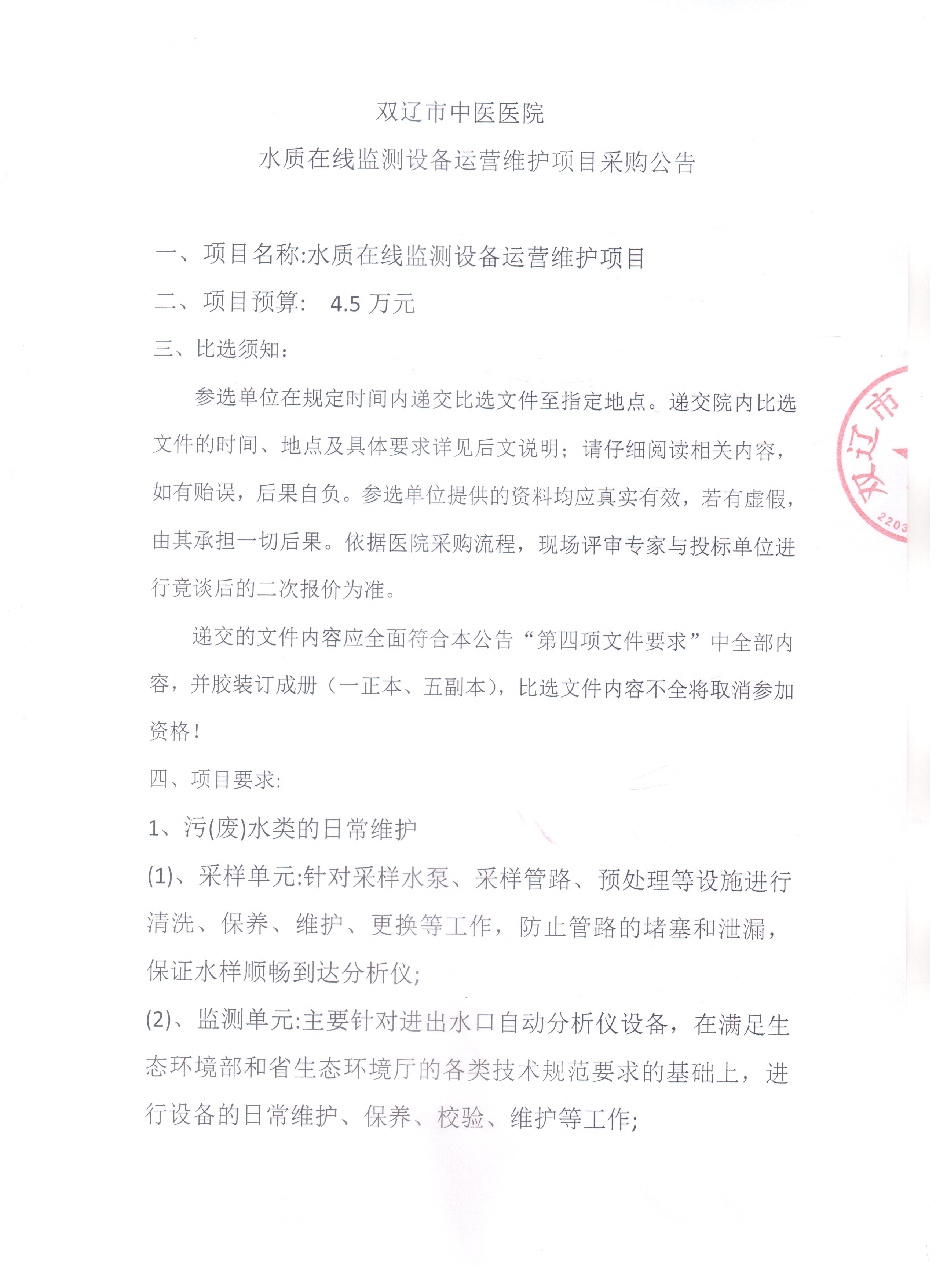 双辽市中医医院总务科水质在线监测设备运营维护项目采购公告