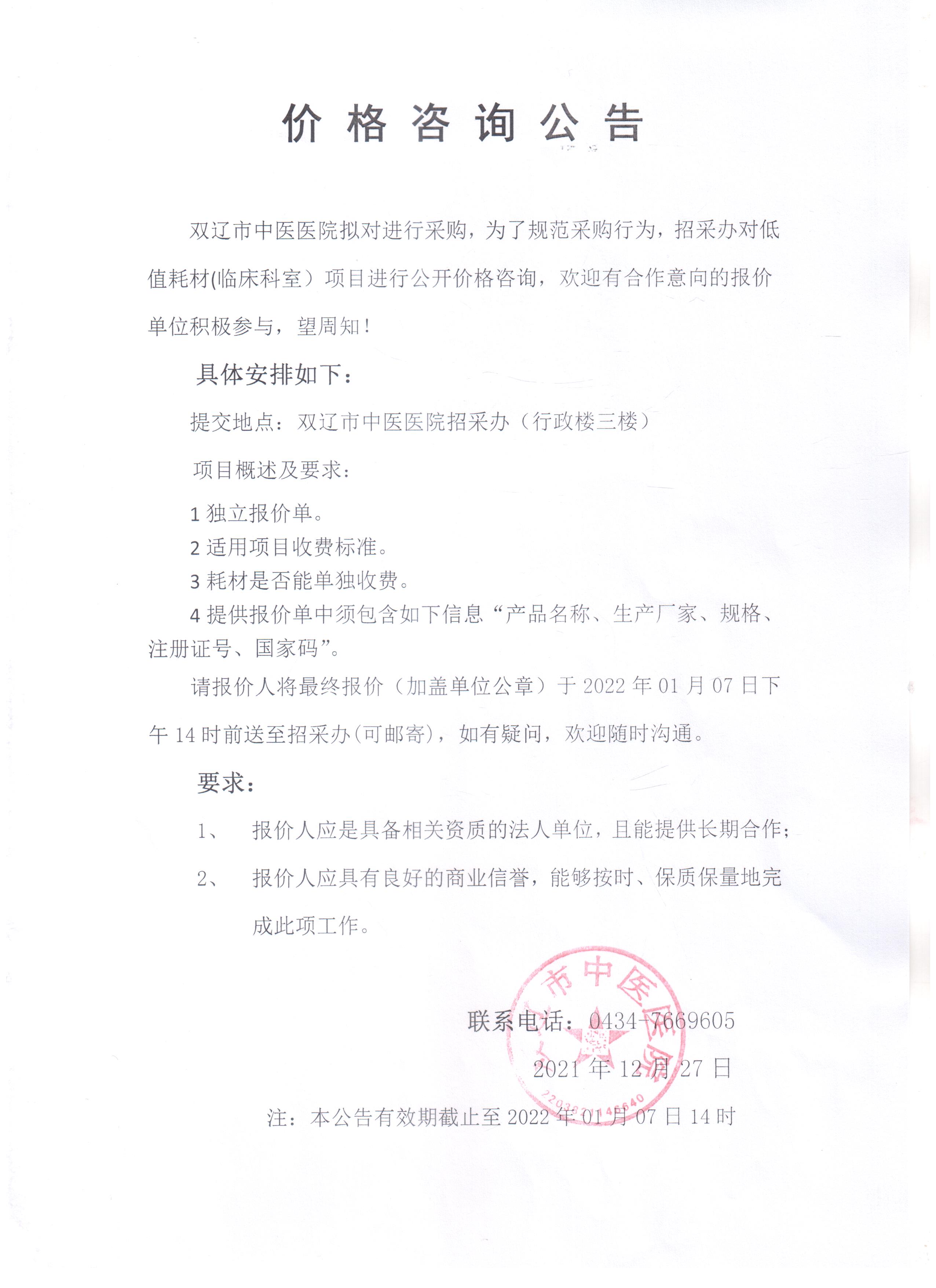 双辽市中医医院低值耗材(临床科室)价格咨询公告
