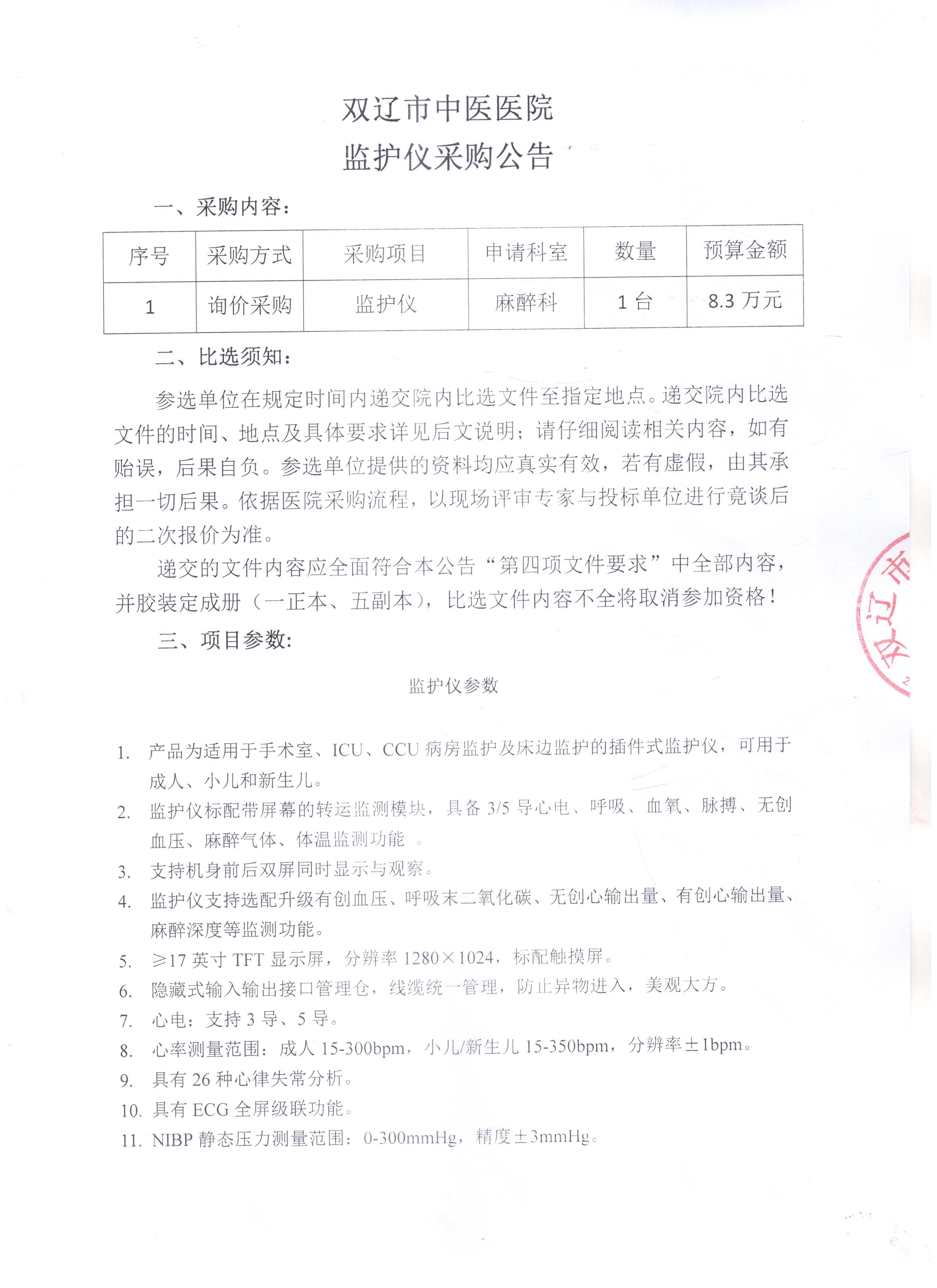 双辽市中医医院监护仪采购公告