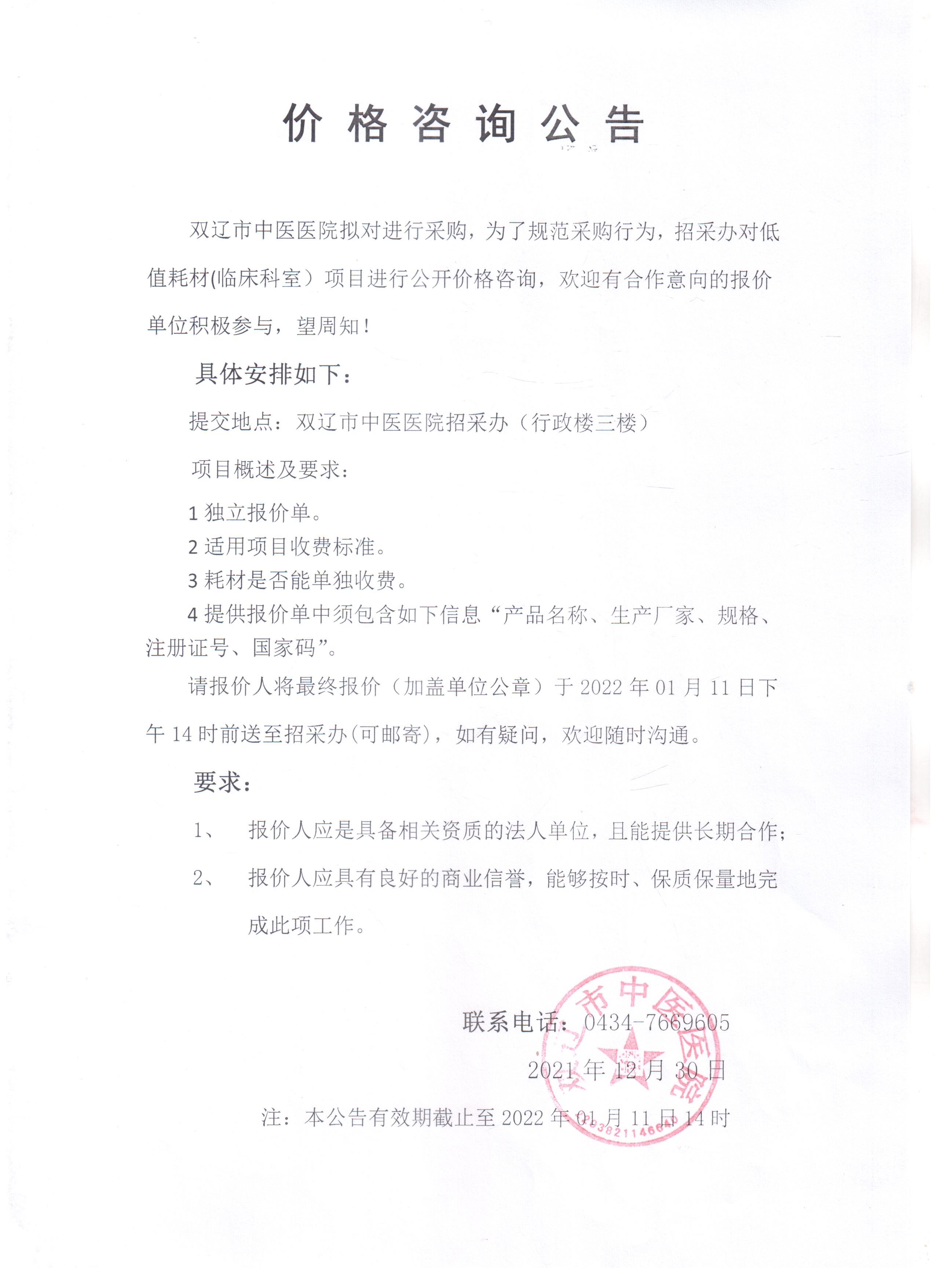 双辽市中医医院低值耗材(临床科室)价格咨询公告